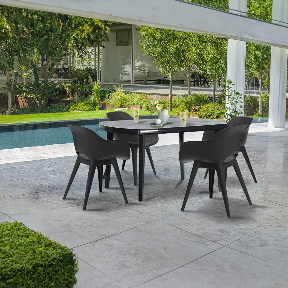 A szett méretének köszönhetően elhelyezhető nagyobb keretekben, vagy kisebb teraszokon is. A műanyag szék különleges és egyedi kartámasszal rendelkezik, amely a stabil szerkezetet és az elegáns kivitelezést egyesíti. A szék tökéletesen illik mind a kertekben, teraszokon, az erkélyen, mind pedig a beltérben is. Szolid, tartós és az időjárás viszontagságainak és UV sugárzásnak ellenálló termék. Az ovális formájú asztal mindenki tetszését elnyeri, aki értékeli a letisztult stílust és az egyszerűséget. A termék összeszerelése könnyű, tisztítása egyszerű. Az asztal ellenáll a sérüléseknek, valamint az időjárás hosszantartó viszontagságainak.