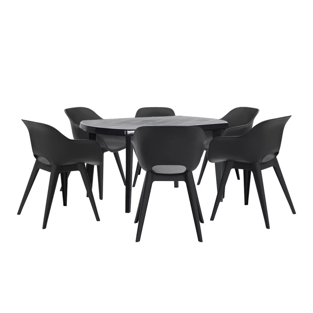 Ez a grafit színű, kényelmes és elegáns bútor szett hat darab 57X56X81 cm-es széket, és egy 137X90X73 cm-es asztalt foglal magában. Ez a 6 személyes kerti bútor szett rendkívül előnyös lehet, ha szeretnéd kiélvezni a szabadban eltöltött időt barátaiddal vagy családoddal. Ideális elemként szolgál a kert, erkély vagy terasz díszítéséhez. Különleges formája és minimalista megjelenése teszi univerzálissá és bármilyen elrendezéshez alkalmazkodik. A szett praktikus megoldás, egész évben a szabadban maradhat, hisz magas a tűröképessége és ellenáll a szélsőséges időjárásoknak.
