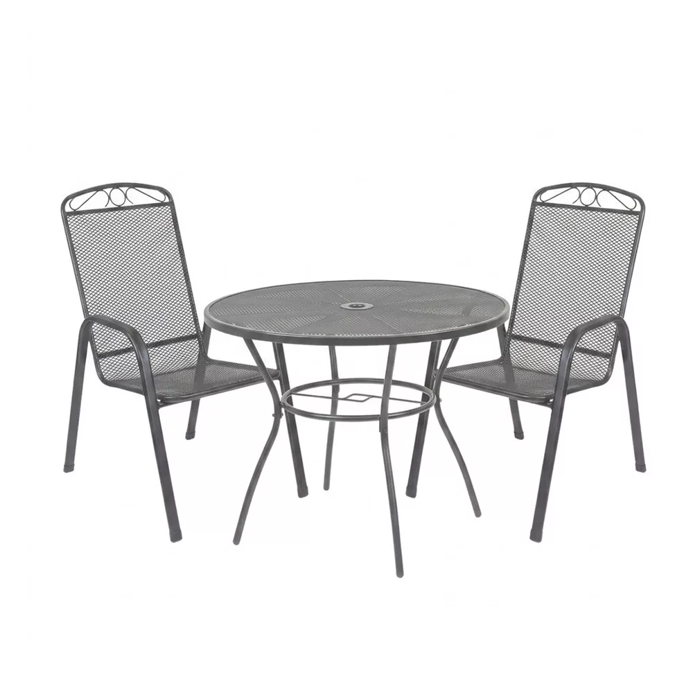 A Leziter Viva Balcony kerti bútor garnitúra szett antracit színben egy Arko kerek kerti asztalt és 2 db Melfi karfás kerti széket tartalmaz, stabil acél szerkezetével, korrózióálló és porszórt felületkezelésével, valamint kompakt kialakításával ideális választás erkélyre, kisebb teraszra vagy kertbe.
