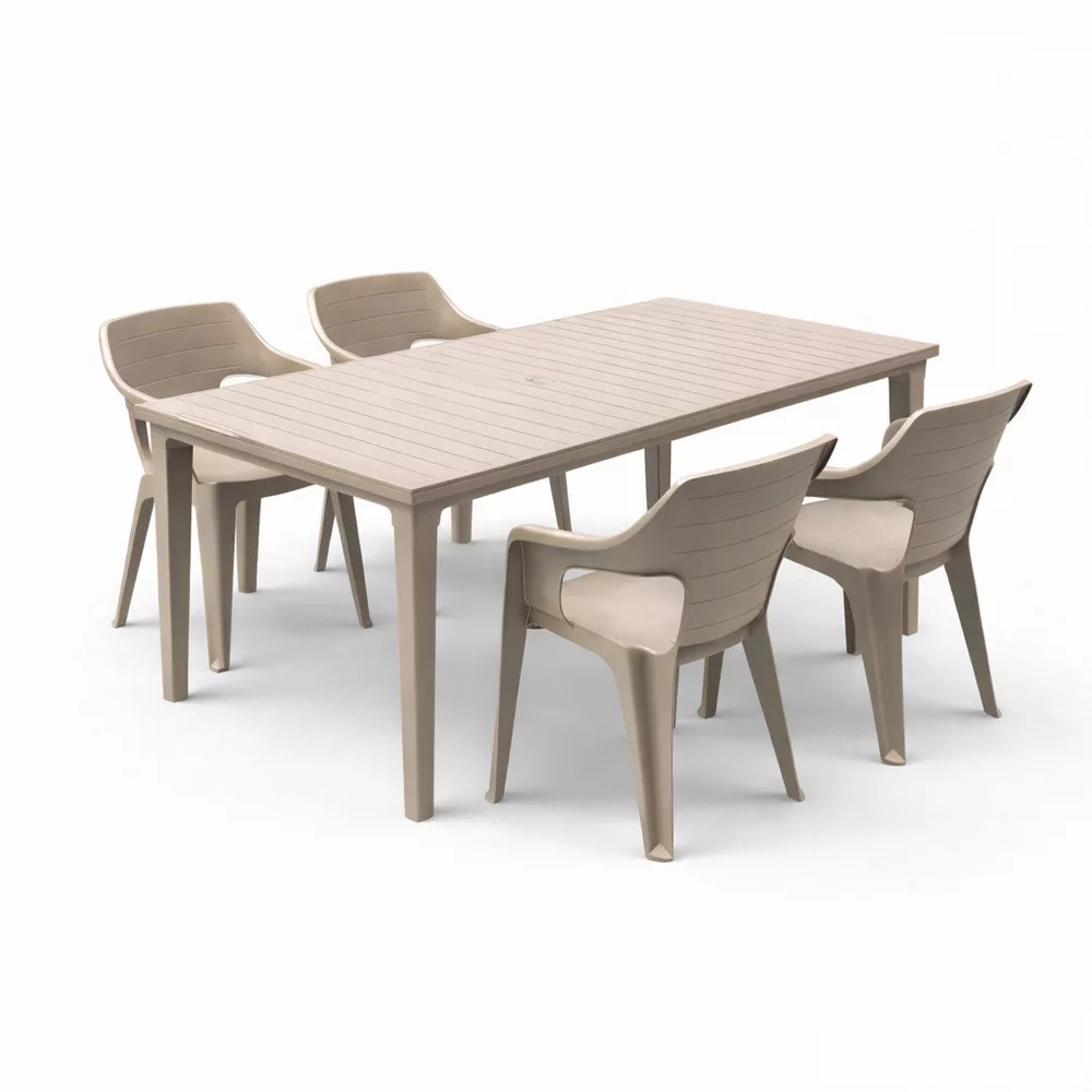 Az Elina 4+1 kerti bútor garnitúra szett cappuccino színben kiváló választás, ha természetes hatású, kényelmes és tartós kültéri étkezőszettet szeretnél.