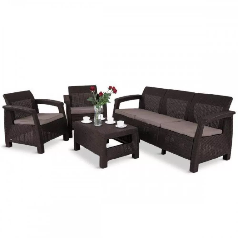 A Corfu Love Duo kerti bútor szett bármilyen kertben, teraszon vagy nagyobb erkélyen tökéletesen mutat. Ez az összeállítás nemcsak rendkívül stílusos, hanem kényelmes és tartós is. A bútorok könnyű felépítésüknek köszönhetően könnyen mozgathatók. A szettben egy kanapé, két kényelmes fotel és egy asztal kapott helyet. A kanapé nagy szélessége miatt elfeküdhet rajta és még aludhat is rajta a kedvenc fája alatt. A fotelekben nyugodtan olvashatja kedvenc régényeit míg az asztalon kényelmesen elfér minden amire a kint töltött idő alatt szüksége lehet.