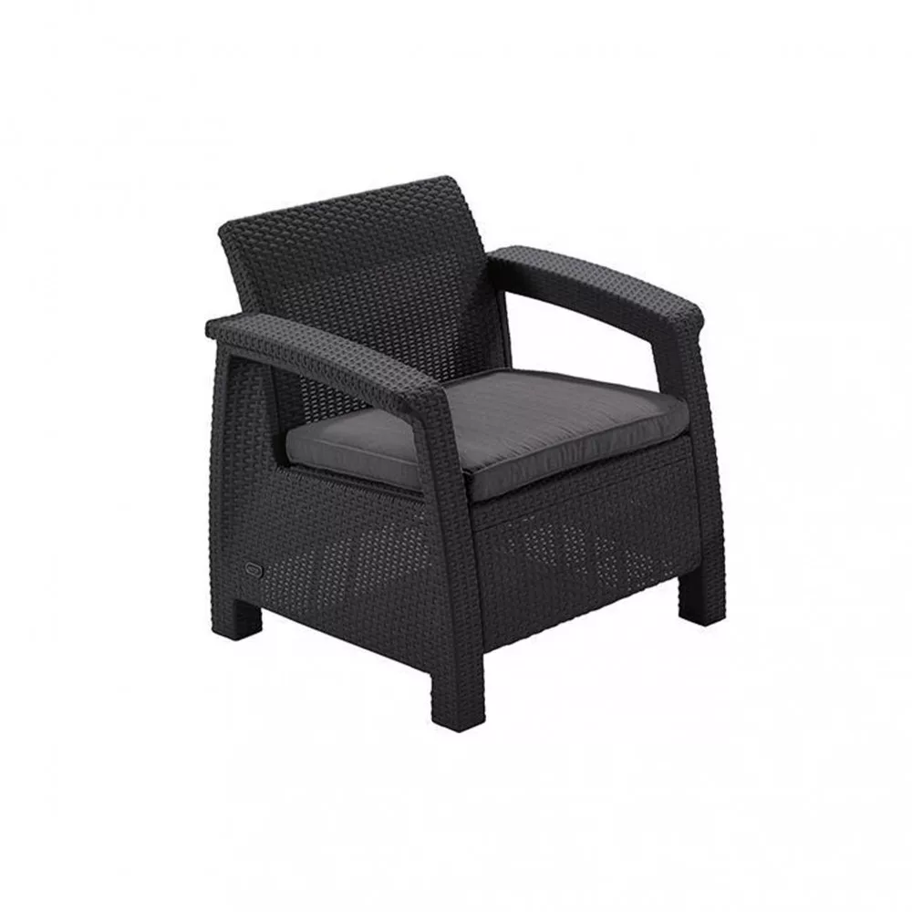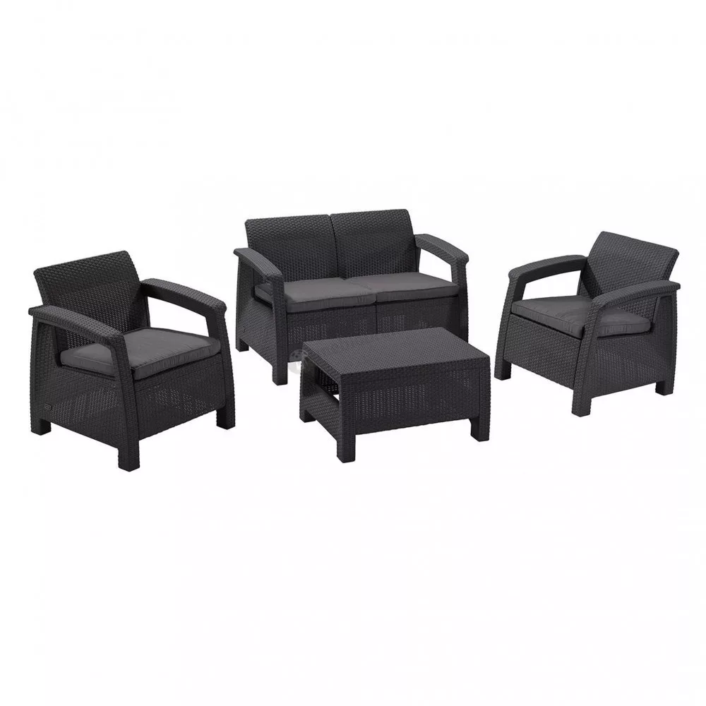 A stílusos Corfu szabadidő bútor szett maximális kényelmet garantál a felhasználók számára. A szettet modern dizájn jellemez, melyet természetes rattan fonás inspirált.A szett stabilitását és kényelmét szolid felépítésének és átgondolt szerkezetének köszönheti. A bútor szett egy kétszemélyes kanapét, két fotelt és egy asztalt tartalmaz. A Corfu termékvonal - kényelmes párnákkal - hatféle színben kapható. A bútorok ellenállnak az időjárás viszontagságainak és az UV sugárzásnak.A bútorokat a Curver gyártja, kiknek termékei megtalálhatóak még Keter és Allibert márkanév alatt is. A Corfu Set egy kiváló minőségű európai termék, amely a legjobb minőségű fröccsöntött műanyagból készült.