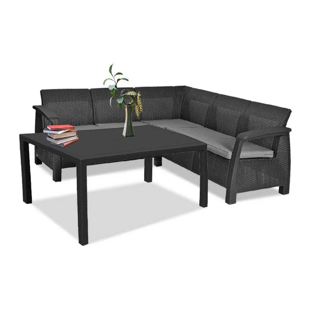 A stílusos Corfu Relax szabadidő bútor szett maximális kényelmet garantál a felhasználók számára. A szettet modern dizájn jellemez, melyet természetes rattan fonás inspirált. A szett stabilitását és kényelmét szolid felépítésének és átgondolt szerkezetének köszönheti. A bútor szett egy L-alakú kanapét és egy asztalt tartalmaz. A Corfu termékvonal - kényelmes párnákkal kapható. A bútorok ellenállnak az időjárás viszontagságainak és az UV sugárzásnak.A bútorokat a Curver gyártja, kiknek termékei megtalálhatóak még Keter márkanév alatt is. A Corfu egy kiváló minőségű európai termék, amely a legjobb minőségű fröccsöntött műanyagból készült.