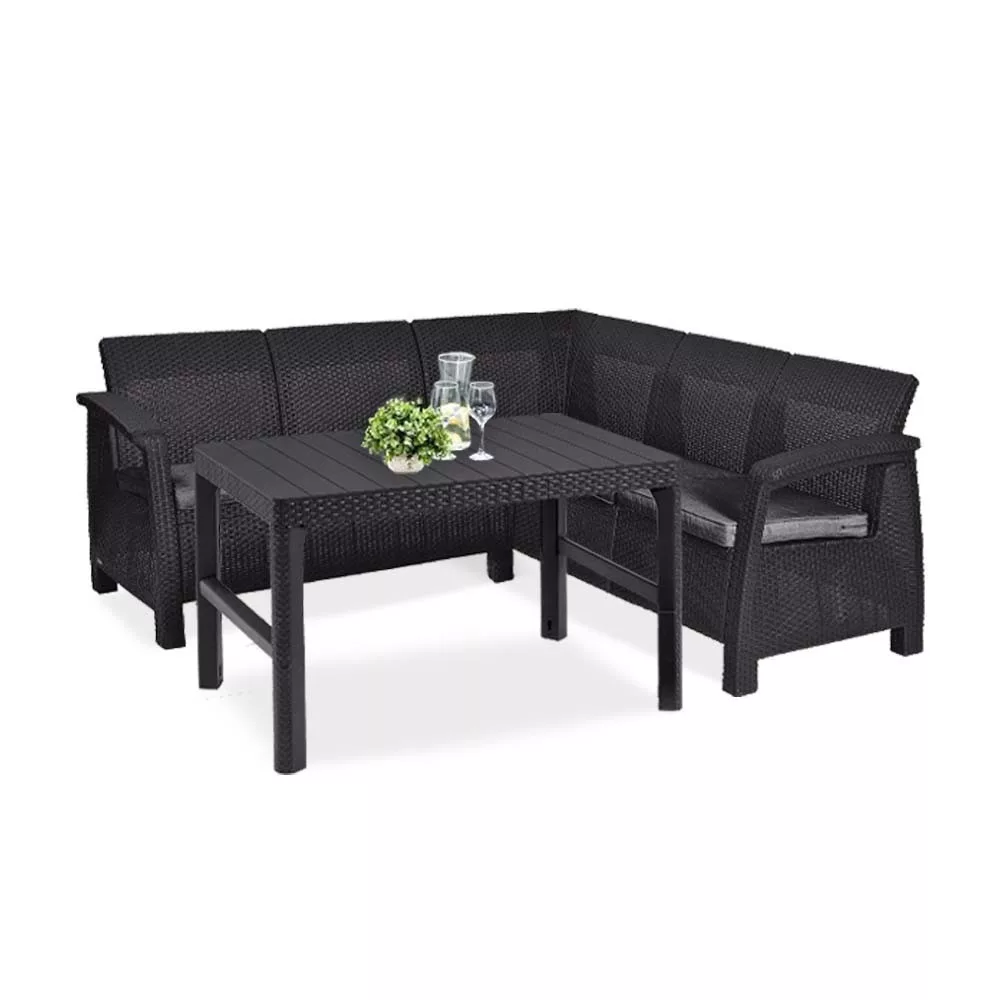 A Corfu relax small sarokgarnitúra lyon asztallal tartós műanyagból készül. A Corfu relax kerti bútor garnitúra kiváló választás vonzó áron. Polipropilénből készült és kompatibilis minden korfu bútorral , amely vizuális megjelenésével utánozza a technorattant. A polipropilén olyan anyag, amely ellenáll a kedvezőtlen időjárási viszonyoknak, az UV sugárzásnak, a hőmérsékleti különbségeknek vagy a mechanikai károsodásoknak, így külső használatra alkalmas.