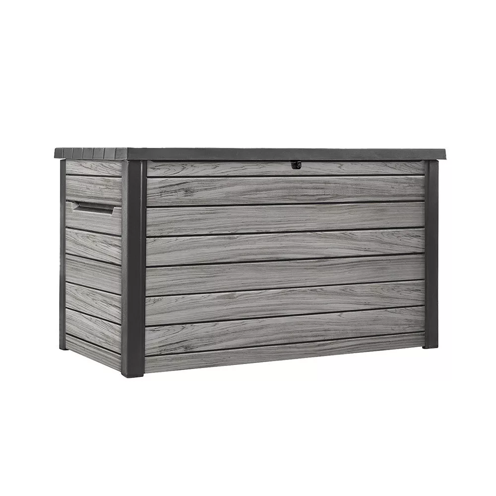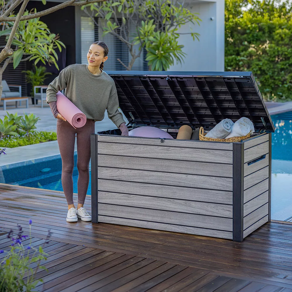 Az egyedi fahatású felület a DecoCoat™ technológiának köszönhetően természetes megjelenést ad a tárolóládának. A viharszürke árnyalat elegáns, letisztult karaktert kölcsönöz, amely jól illeszkedik modern teraszokhoz, medenceparti környezethez és igényesen kialakított kertekhez.