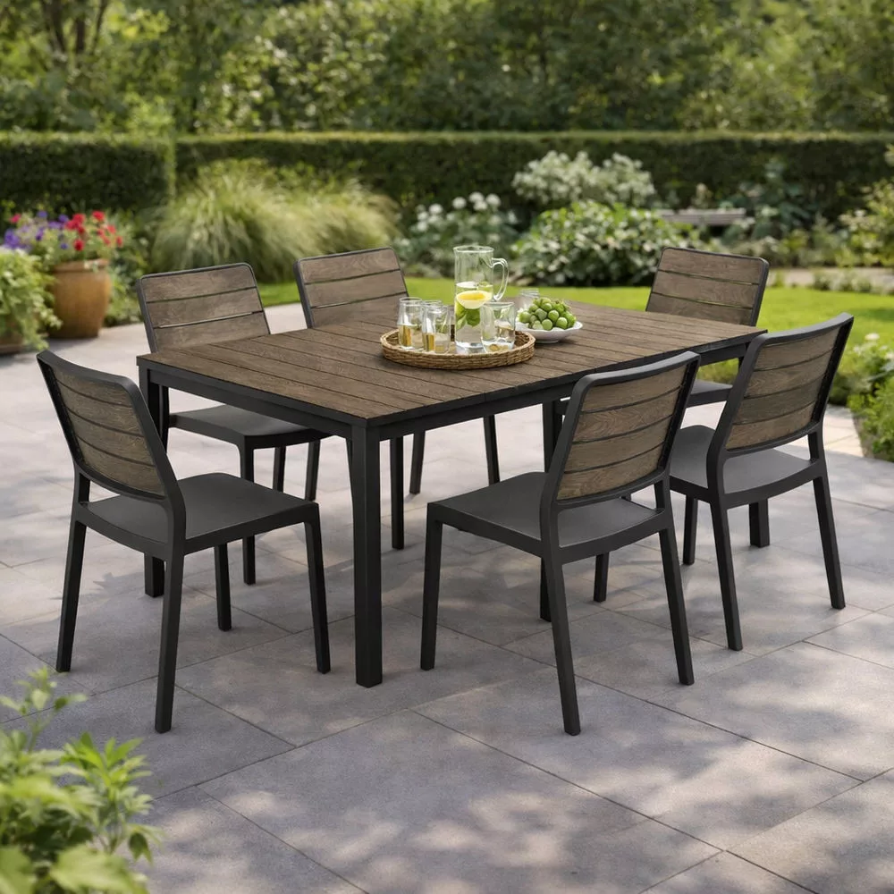A Porto Nova 160 kerti asztal modern kialakításával és természetes fa hatású felületével stílusos megjelenést biztosít a kertben vagy a teraszon. Ideális választás családi étkezésekhez és baráti összejövetelekhez.