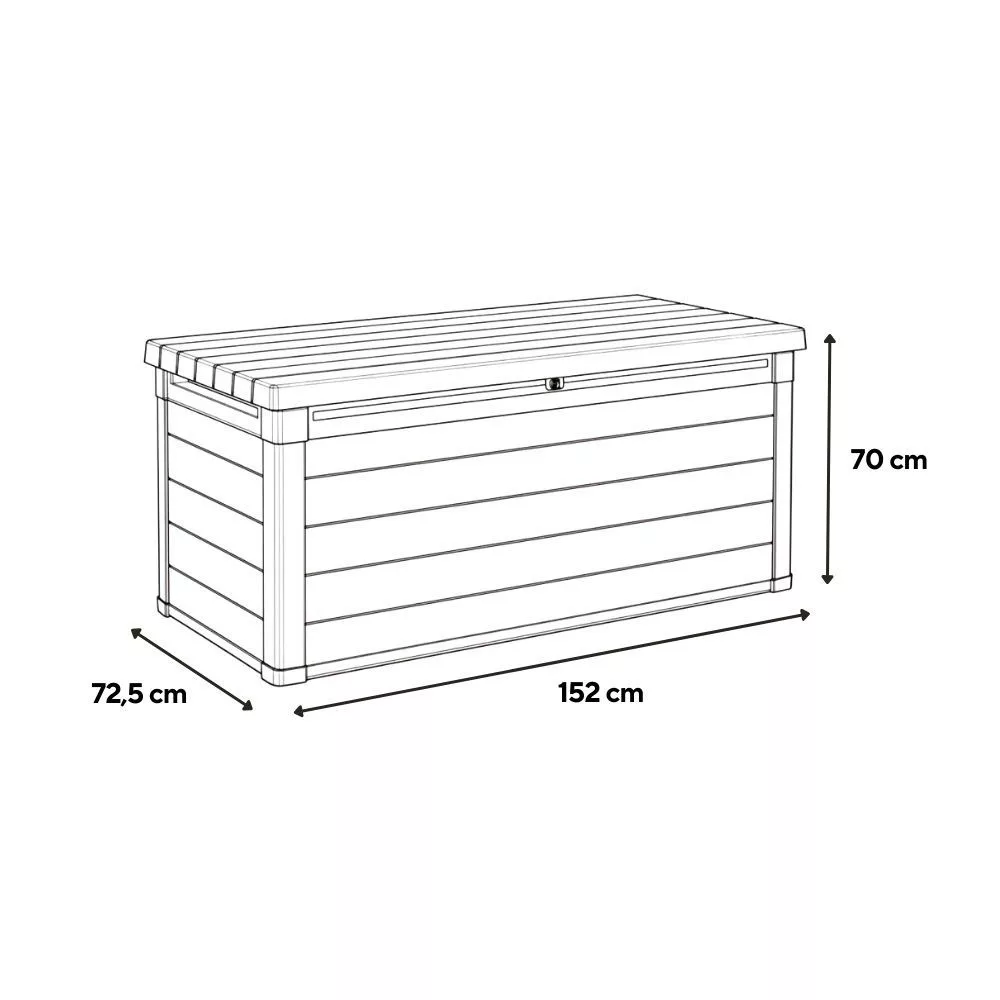 A stabil szerkezet és az arányos kialakítás lehetővé teszi, hogy a kerti láda nagyobb teraszon, kertben vagy akár fedett kültéri részen is jól elhelyezhető legyen. A zárható fedél segít a tárolt eszközök biztonságos tárolásában, miközben a nagy kapacitás hozzájárul a rendezett, átlátható kültéri környezet kialakításához.