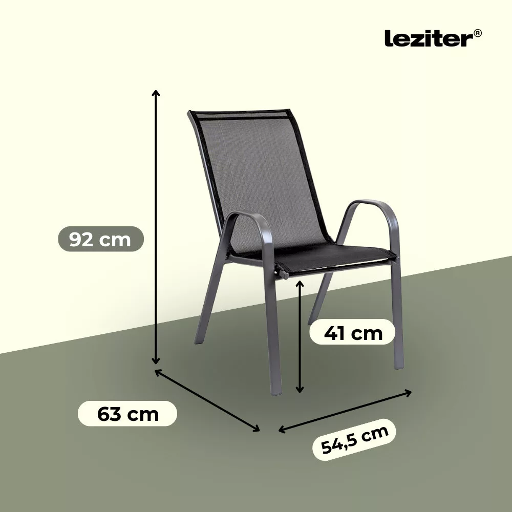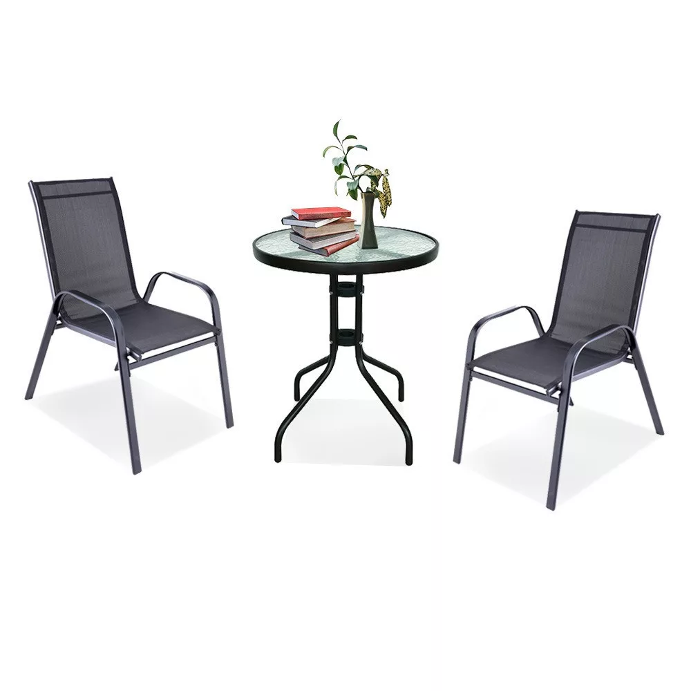 A modern kivitelű kerti bútorkészlet egy kerti üveglapos asztalt és 2 karfás széket tartalmaz, melyek teherbírása 120 kg. A bútorokat 2 fő számára tervezték. A székek és az asztal lábazata fémből készül. Az asztallap 5 mm-es edzett üvegből készült, amely ellenáll a kisebb karcolásoknak. Az textilén szék ülésanyaga ellenáll az időjárási viszonyoknak. Előnye az ergonómikusan profilált ülés és karfa, amelyek tehermentesítik a vállakat pihenés közben.
