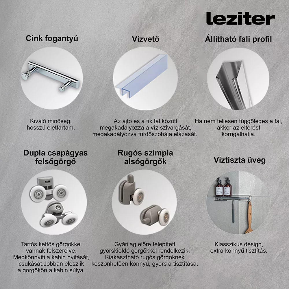 A Leziter Spirit Clear zuhanykabin üvege 5 mm vastag, edzett biztonsági üvegből készül, amely a hagyományos üvegnél jóval ellenállóbb és biztonságosabb. A víztiszta felület világos és légies összhatást biztosít, miközben extra könnyű tisztítani, ellenáll a vízkőnek és az ujjlenyomatoknak. Az edzett üveg törés esetén apró, tompa szilánkokra esik szét, így biztonságos választás a mindennapi használatban, akár családok számára is.