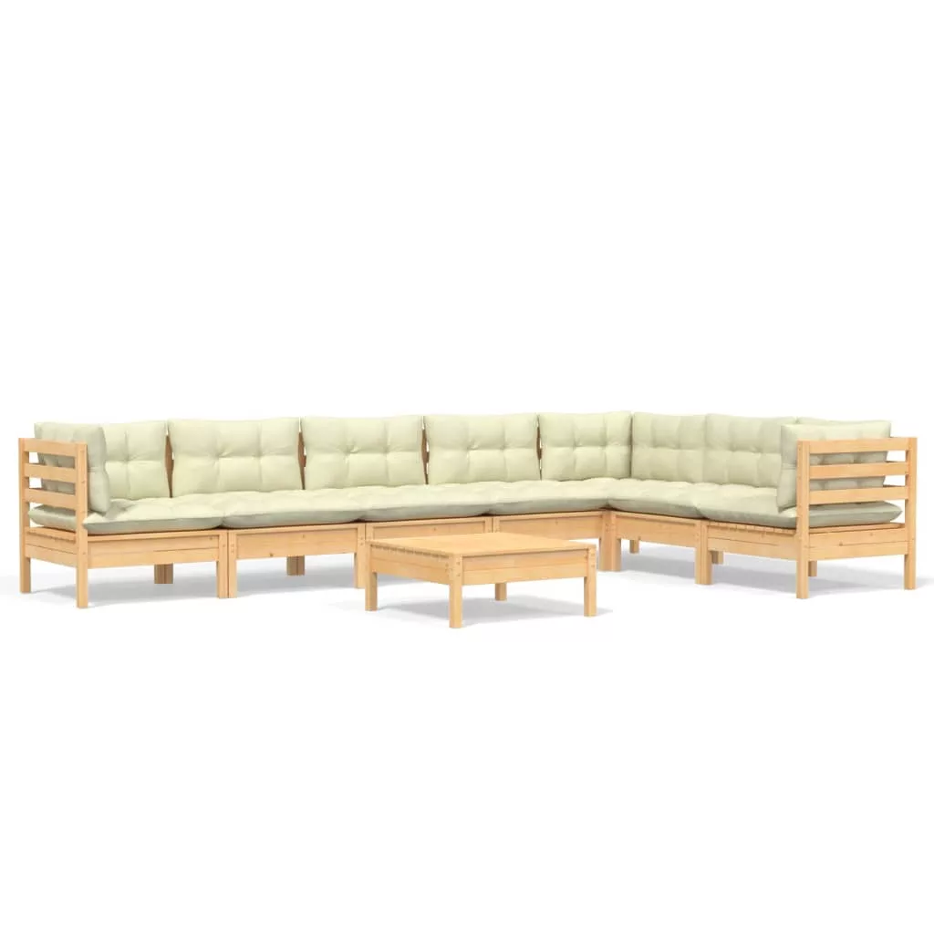8 részes tömör fenyőfa kerti bútorgarnitúra krémszínű párnával