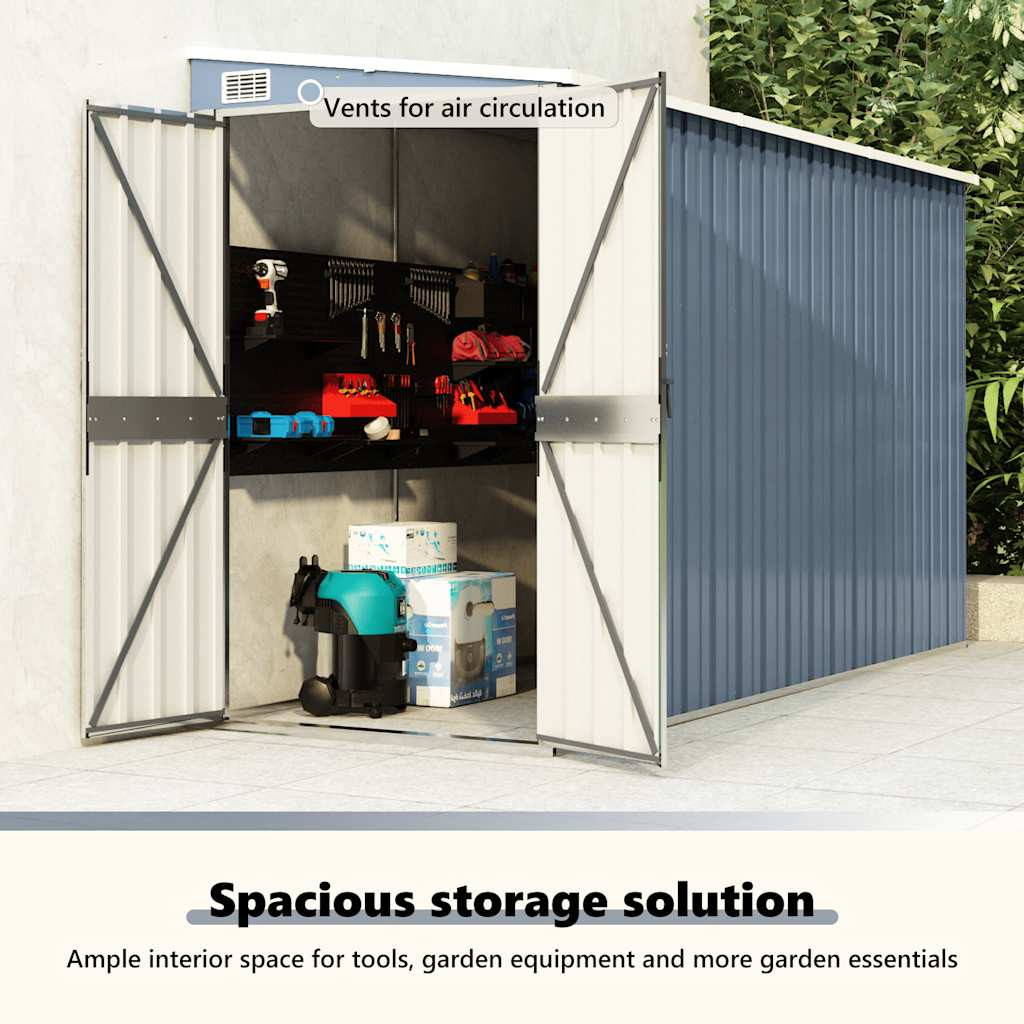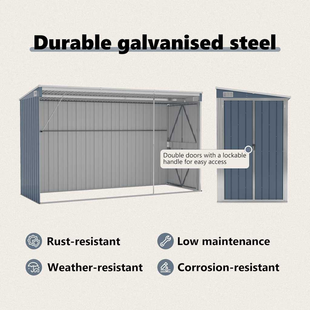szürke acél falhoz erősíthető kerti fészer 118 x 288 x 178 cm