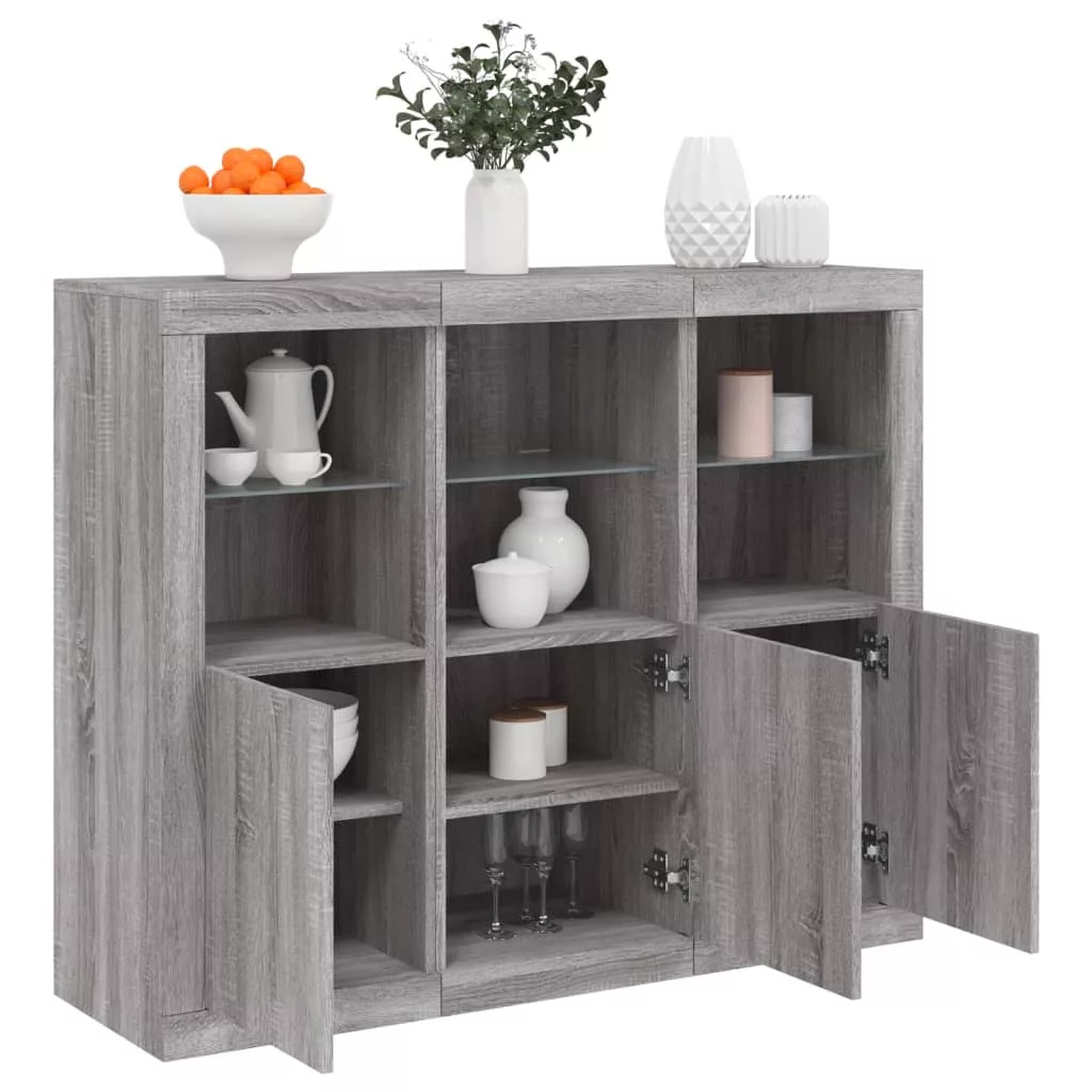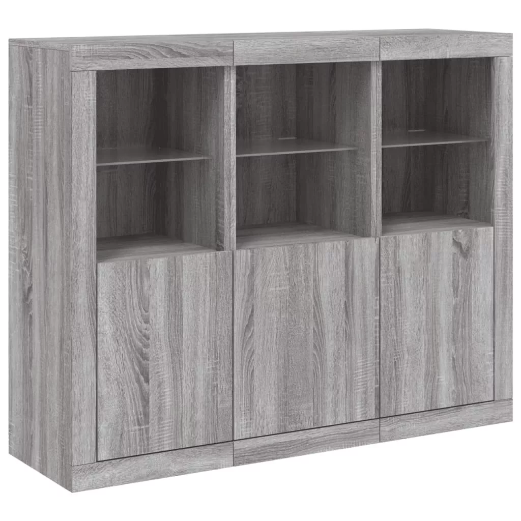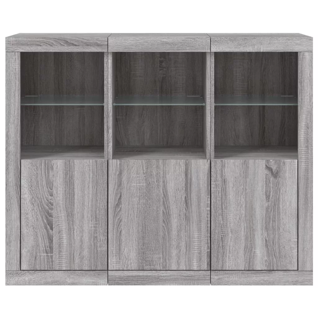 3 db szürke sonoma színű szerelt fa tálalószekrény LED-ekkel