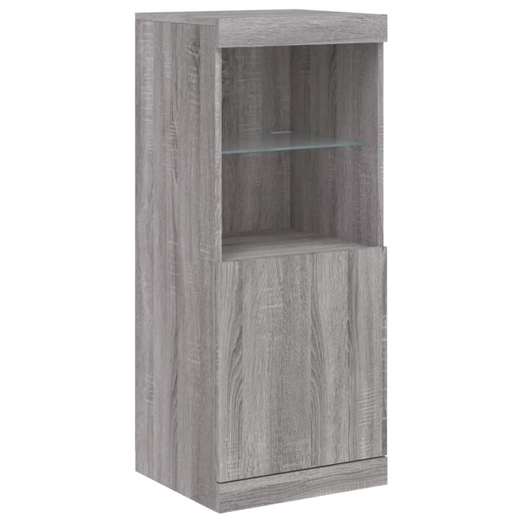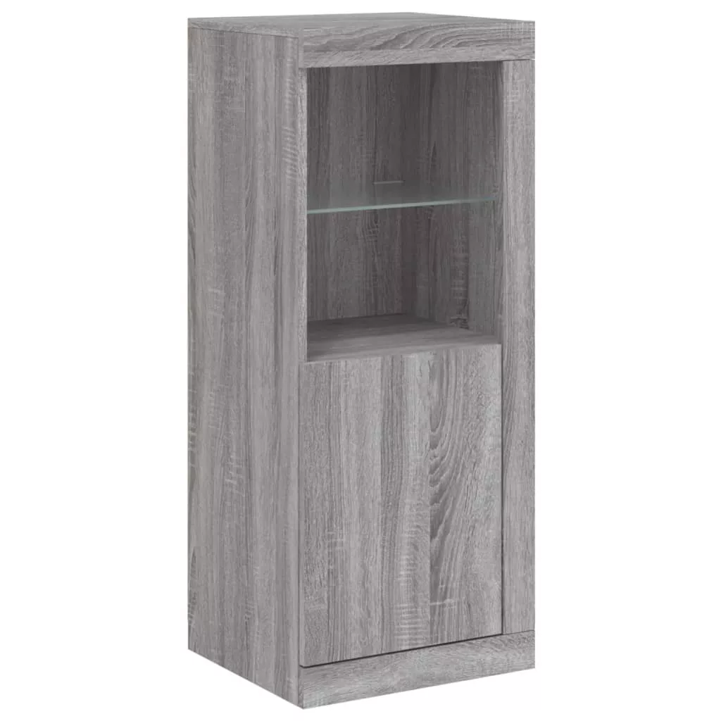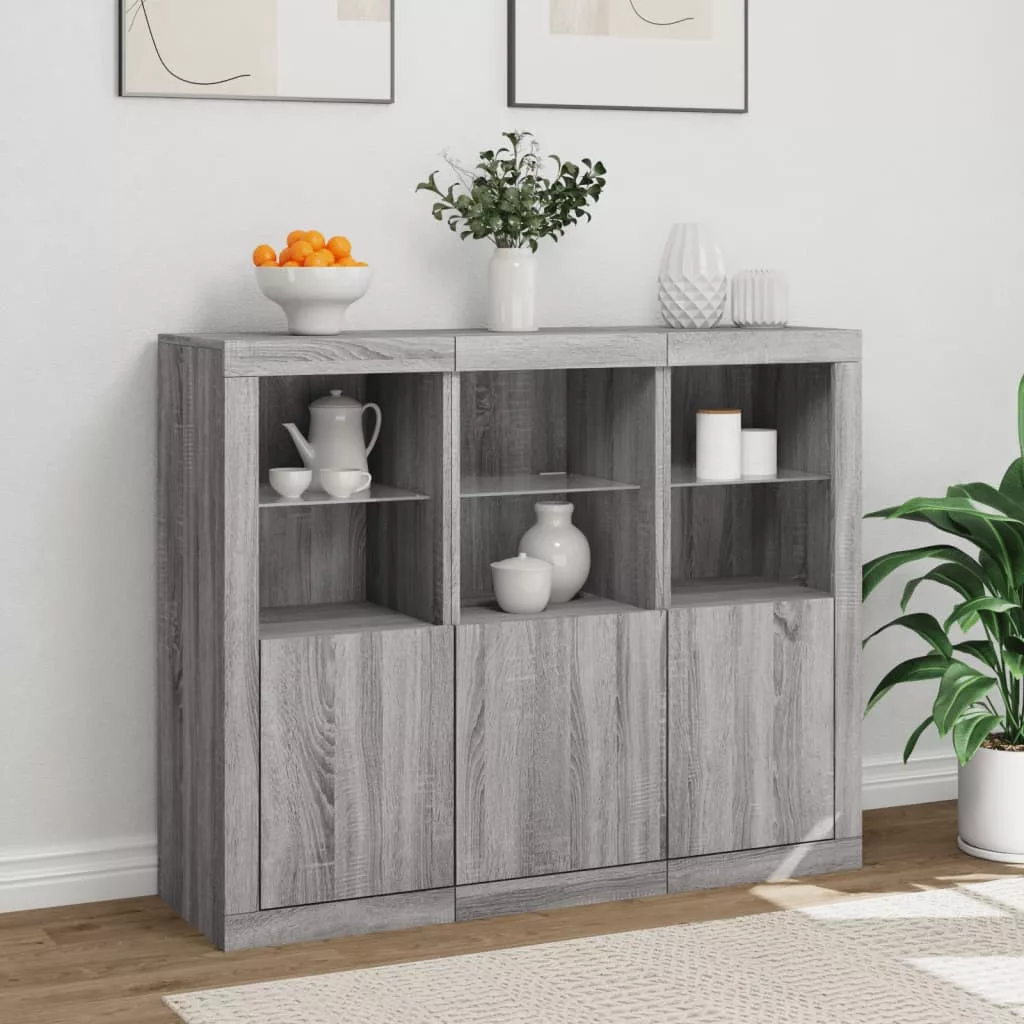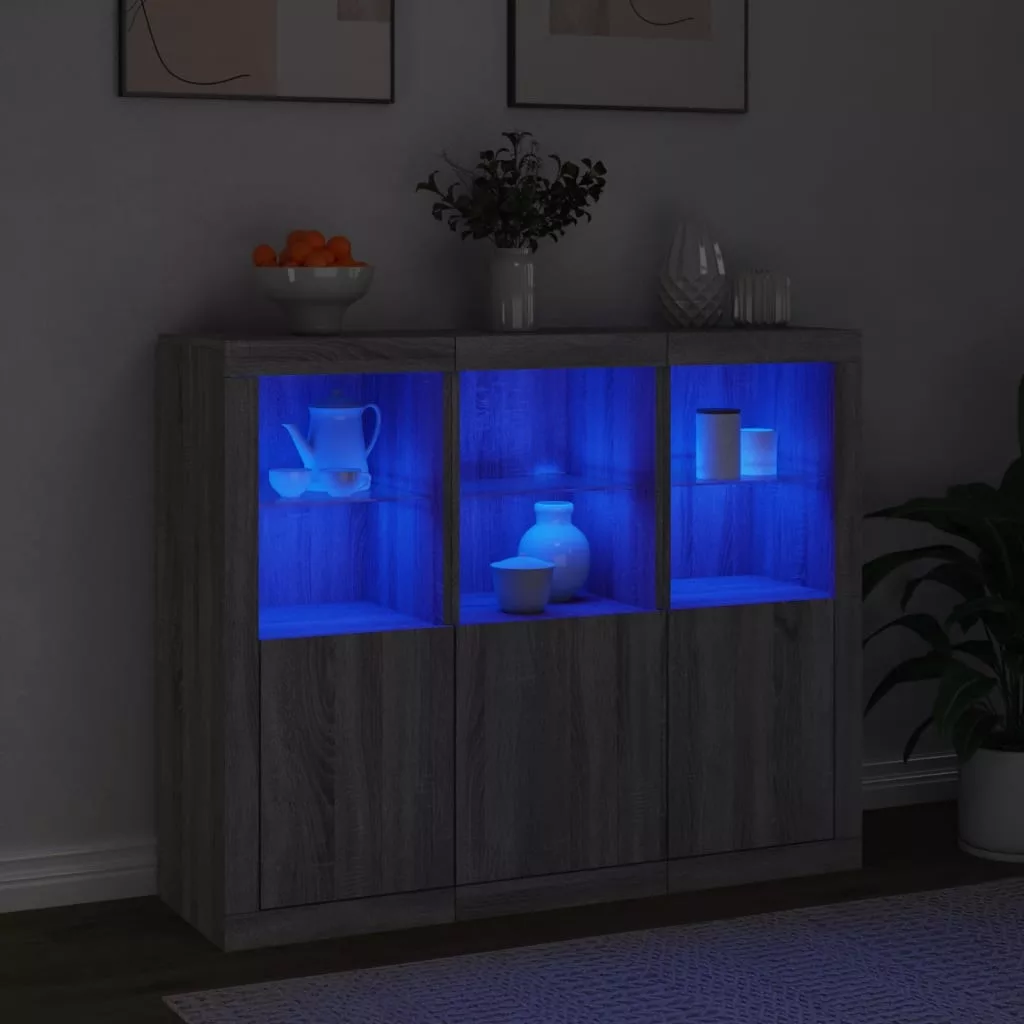 3 db szürke sonoma színű szerelt fa tálalószekrény LED-ekkel
