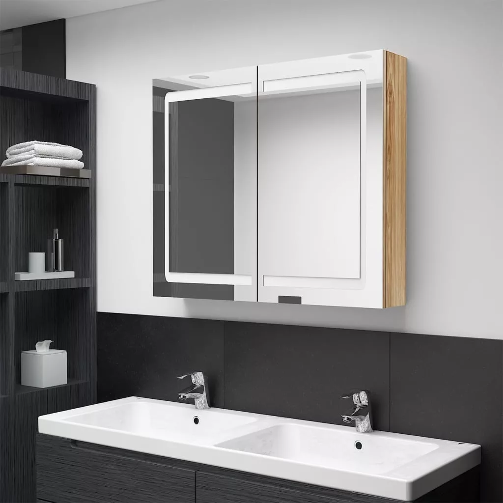 tölgyszínű LED-es tükrös fürdőszobaszekrény 80 x 12 x 68 cm