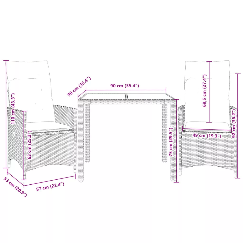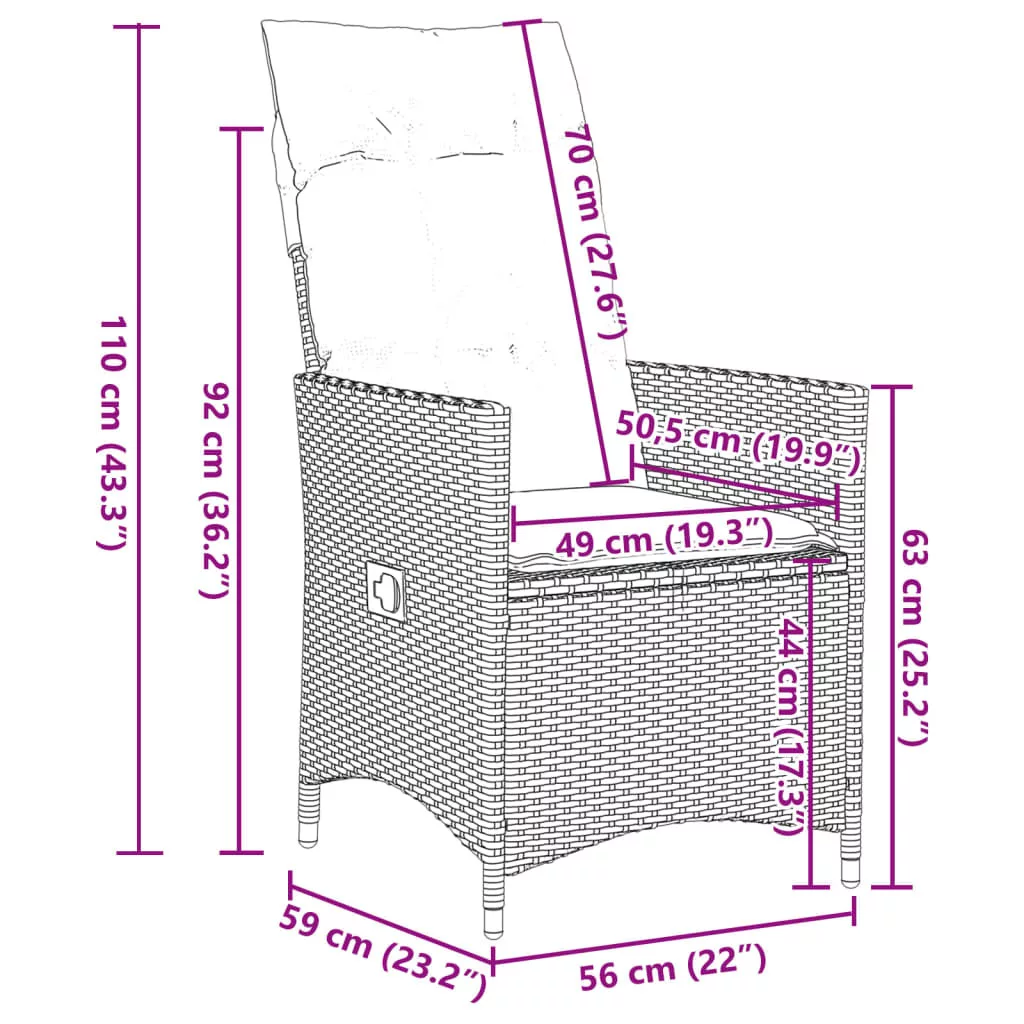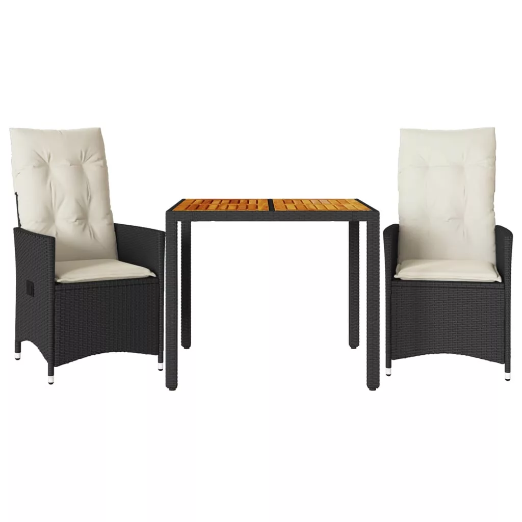 Kávézzon vagy csevegjen családjával és barátaival a kertben, az udvaron vagy az erkélyen ezzel a kényelmes bisztrókészlettel! Tartós anyag: A PE rattan, más néven polyrattan, egy erős, kevés karbantartást igénylő szintetikus anyag, amely úgy néz ki, mint a természetes rattan. Könnyű, könnyen tisztítható, tartóssága és időjárásálló tulajdonságai miatt gyakran használják kültéri bútorok készítéséhez.Állítható háttámla: Ez a kerti szék fogantyúval rendelkezik. A háttámlát a fogantyú meghúzásával tetszőleges pozícióba állíthatja, és gyorsan visszahelyezheti eredeti helyzetébe.Stabil és könnyen tisztítható asztallap: A kerti asztal akácfa lapja masszív, tartós és nedves ruhával könnyen tisztítható.Kényelmes ülőélmény: Ez a vastagon bélelt párnákkal kiegészített kültéri bútorkészlet kényelmes ülőélményt kínál.Levehető és mosható huzat: Ezek az ülőpárnák levehető huzattal rendelkeznek az egyszerű mosás és karbantartás érdekében. Jó tudni:A kültéri bútor szépségének megőrzése érdekében javasoljuk, hogy vízálló huzattal fedje be.