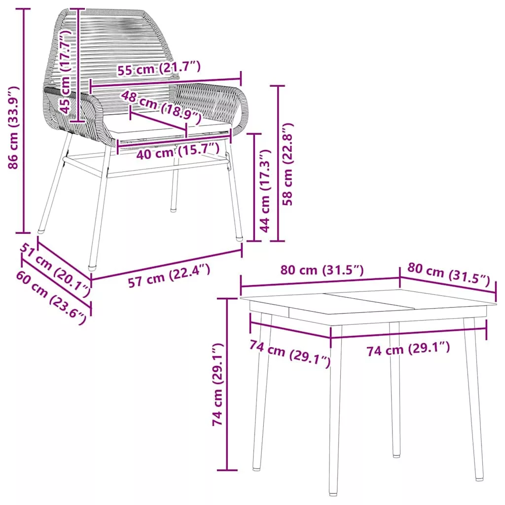 Ez a kerti étkezőgarnitúra nagyszerű választás a szabadban való étkezéshez, vagy csak pihenéshez a kertben, az udvaron vagy a teraszon. Tartós anyag: A PE rattan, más néven polyrattan, egy erős, kevés karbantartást igénylő szintetikus anyag, amely úgy néz ki, mint a természetes rattan. Könnyű, könnyen tisztítható, tartóssága és időjárásálló tulajdonságai miatt gyakran használják kültéri bútorok készítéséhez.Robusztus és stabil váz: A porszórt acélváz erős, stabil, tartós, ellenáll a korróziónak és a zord időjárásnak, így biztosítja a tartós használatot.Praktikus háttámla és kartámasz: Ez a kerti szék háttámlával és két karfával rendelkezik, amelyek optimális támaszt és kényelmet nyújtanak a felhasználóknak.Levehető és mosható huzat: Ezek az ülőpárnák levehető huzattal rendelkeznek az egyszerű mosás és karbantartás érdekében.Üveg asztallap: A kültéri asztallap erős és tartós edzett üvegből készült, így nedves ruhával könnyen tisztítható, és egy csipetnyi eleganciát kölcsönöz a kültéri környezetnek. Jó tudni:A kültéri bútor szépségének megőrzése érdekében javasoljuk, hogy vízálló huzattal fedje be. Maximum 110 kg ülésenként. Ügyeljen a nyílt tűz és más erős hőforrások veszélyére a termék közelében.