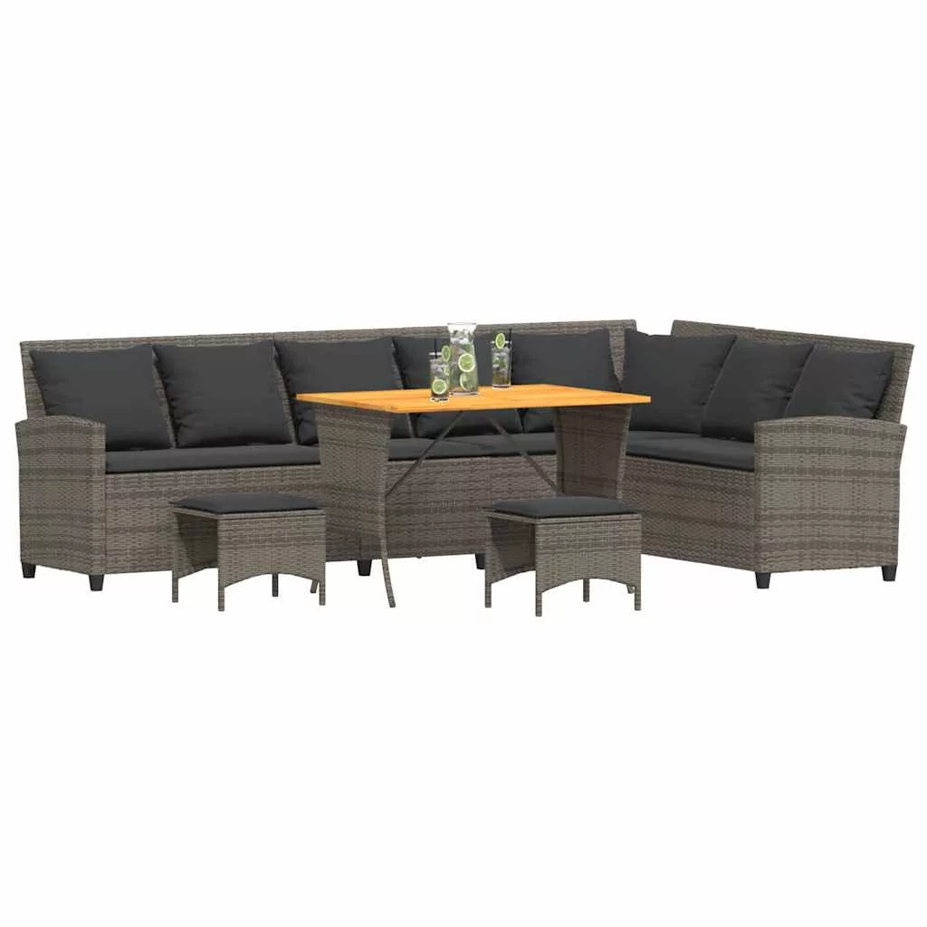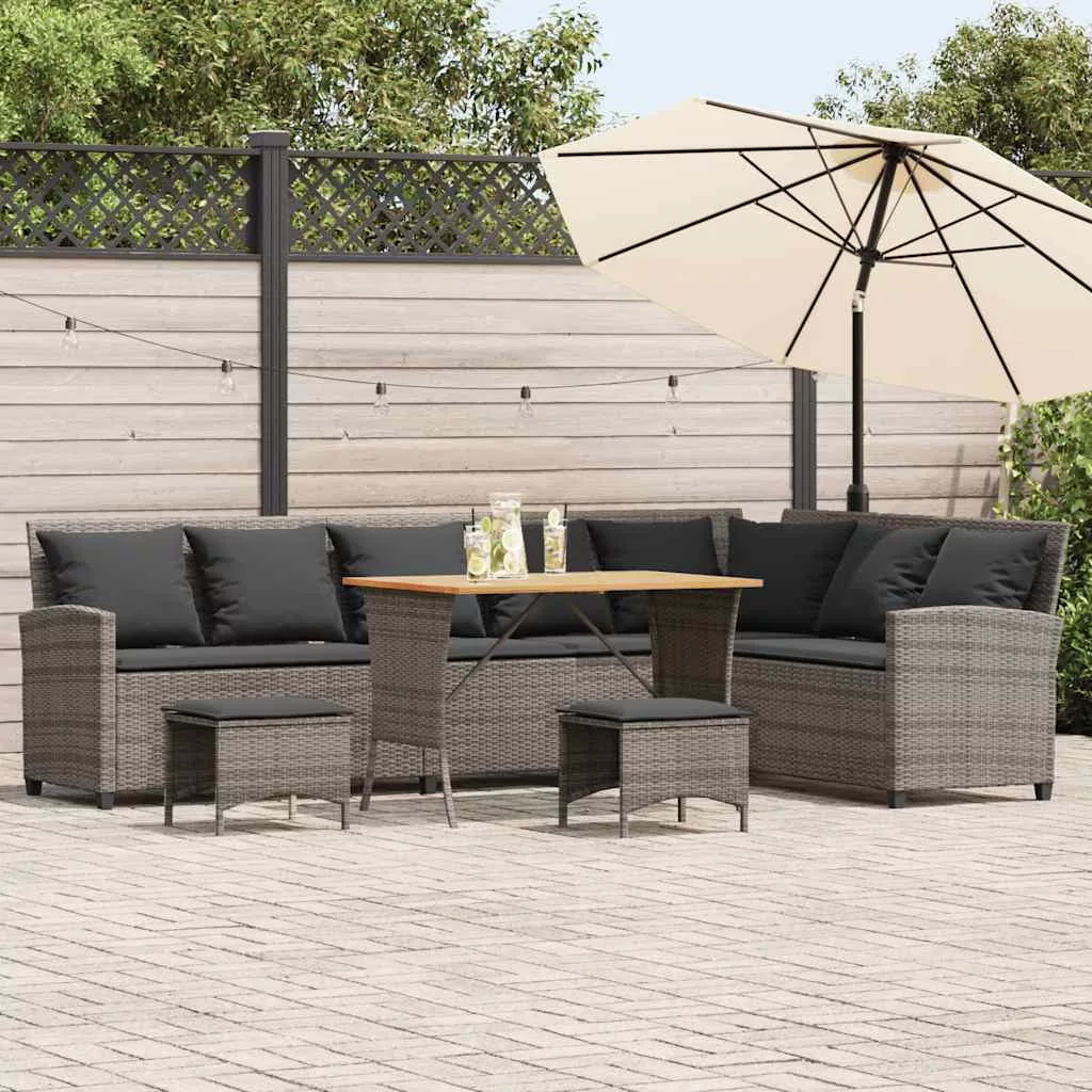 Ez az L alakú kerti kanapé tökéletes kiegészítője kertjének, teraszának vagy teraszának, kényelmes és hívogató helyet biztosítva a családdal és barátokkal való beszélgetéshez vagy egyszerűen csak a pihenéshez és a szabadban való kikapcsolódáshoz. Tartós anyag: A PE rattan, más néven polyrattan, egy erős, kevés karbantartást igénylő szintetikus anyag, amely úgy néz ki, mint a természetes rattan. Könnyű, könnyen tisztítható, tartóssága és időjárásálló tulajdonságai miatt gyakran használják kültéri bútorok készítéséhez.Stabil és könnyen tisztítható asztallap: A kerti asztal akácfa lapja masszív, tartós és nedves ruhával könnyen tisztítható.Kényelmes ülőélmény: Ez a vastagon bélelt párnákkal kiegészített kültéri bútor kényelmes ülőélményt kínál.Sokoldalú lábzsámoly: A zsámoly sokoldalú, kényelmes lábtámaszként szolgál, amikor a kanapén pihen, de szolgálhat kiegészítő ülőhelyként is a kertben.Levehető és mosható huzat: Ezek az ülőpárnák levehető huzattal rendelkeznek az egyszerű mosás és karbantartás érdekében. Jó tudni:A kültéri bútor szépségének megőrzése érdekében javasoljuk, hogy vízálló huzattal fedje be.