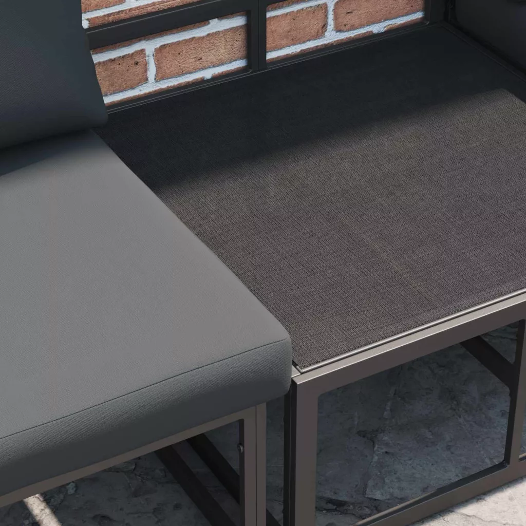 A Kerti Kanapé Szett a modern dizájn és a tartós alumínium tökéletes egyensúlyát tükrözi, szuper középpont a kültéri teredhez. Formás vonalai és praktikus funkciója nemcsak a tavaszi vagy nyári borongós összejövetelekhez ideális, de vizuálisan feldobják a teraszt vagy a kertet is. Ez a hívogató tér, ahol a család és a barátok lazíthatnak, tökéletes háttere a felejthetetlen kültéri élményeknek.]},{ Prémium anyagok: A kanapé szett tartós alumíniumból készült, és a fekete-antracit színek harmonikus kombinációja egy impozáns külsőt ad neki. Ez a választás nemcsak a dizájnt erősíti, hanem a fakulás elleni tartósságot is, így sokáig élvezheted. Funkcionális elemek: Időjárásálló kültéri párnákkal és mosható huzattal van ellátva, ezért könnyen karbantartható. Az állítható lábak stabilitást biztosítanak az egyenetlen felületeken, így bármilyen környezetben használhatod. Állítható jellemzők: A magasságban állítható lábai biztosítják a tökéletes illeszkedést bármilyen talajhoz, kényelmet és stabilitást nyújtva. Kültéri sokoldalúság: Kifejezetten kültéri használatra tervezve, ez a szett barátságos találkozóhellyé válik, ahol lehet pihenni teraszokon vagy udvarokban a melegebb hónapokban. Egyszerű karbantartás: Egyszerű karbantartási útmutatókkal van felszerelve, így könnyen megőrizheted a szett állapotát. Csak takard le, amikor nem használod, hogy sokáig megmaradjon jól.