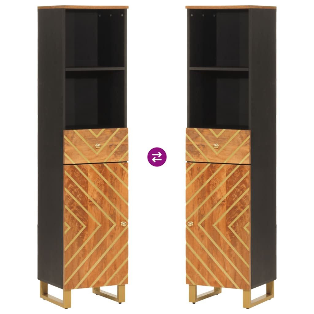 Ez a fürdőszobaszekrény nagyszerű választás fürdőszobája rendezetté varázsolásához! Tömör mangófa: A tömör mangófa egy erős, trópusi keményfa, melyből strapabíró bútorok készíthetőek. A fa gyönyörű erezetének köszönhetően minden darab kissé különbözik a többitől. A tömör mangófából készült fürdőszobai tárolószekrény rendkívül strapabíró és stabil.Bőséges tárolóhely: Ez a fürdőszobaszekrény bőséges helyet kínál alapvető kellékei kézközelben történő rendezett tárolásához.Rugalmas ajtó telepítés: Az ajtót saját igényei szerint bal vagy jobb oldalra is beépítheti.Masszív lábak: A vaslábak szilárdságot és stabilitást biztosítanak a fürdőszobai szekrénynek. Figyelem:A felborulás elkerülése érdekében ezt a terméket a mellékelt fali rögzítőeszközzel kell használni.