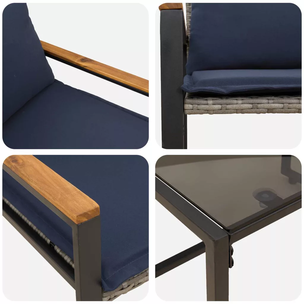 Ez a modern kültéri bútor szett mindenkinek szól, aki a stílust és kényelmet keresi a kertjében vagy teraszán. Tiszta vonalaival és minimalista dizájnjával egyszerű, de funkcionális megoldást kínál, ami üdvözlően feldobhat bármilyen kültéri teret, miközben remek helyet biztosít a baráti összejövetelekhez vagy a napfényes pihenőidőhöz. A székek esztétikai vonzereje és praktikussága miatt ez a bútorkészlet tökéletesen ötvözi a modern stílust a kényelemmel. Tartós rattán elemek: A háttámla és keret prémium rattán készült, ami véd a viharos időjárástól, így hosszú ideig bírja. Természetes textúrája és vonzó dizájnja miatt remekül passzol a kültéri designba, fokozva a kert és terasz megjelenését. Kényelmes ülések: Minden széket memóriahab párnák díszítenek, amiket tartós poliészter borít, és úgy lettek megalkotva, hogy kényelmesen kövessék a test kontúrját. Ez a párnázás páratlan élményt nyújt hosszú ülésekhez, ideális baráti ecseteléshez vagy csendes olvasgatáshoz. Rugalmas kartámasz dizájn: A masszív akácfából készült lapos kartámaszok nyújtanak támogatást beszélgetéshez vagy olvasáshoz. Prémium anyag kiválasztása tartós és elegáns érzést ad a bútornak, ellenállva mindennek. UV védelem és tartósság: A speciális UV-álló anyagok megóvják a napfény káros hatásaitól, így biztosítva, hogy a bútor épek és vonzóak maradjanak egész évben. Ez a tulajdonság segít fenntartani a szett vibráló kinézetét és hosszú élettartamát. Felhasználóbarát karbantartás: Levehető párnahuzattal és egyszerű cipzáras zárással könnyen tisztítható. Az egyszerű összeszereléshez csak két szerszám szükséges, így a tulajdonosok inkább a szórakozásra koncentrálhatnak, mint a karbantartásra.