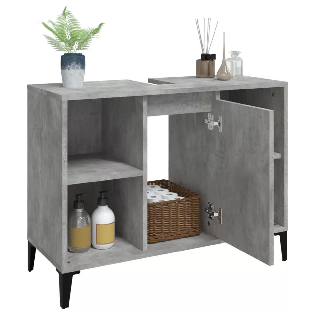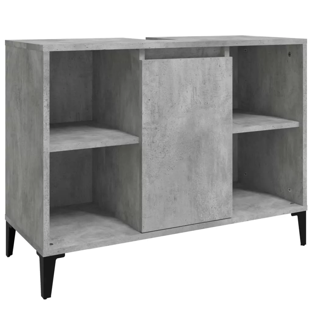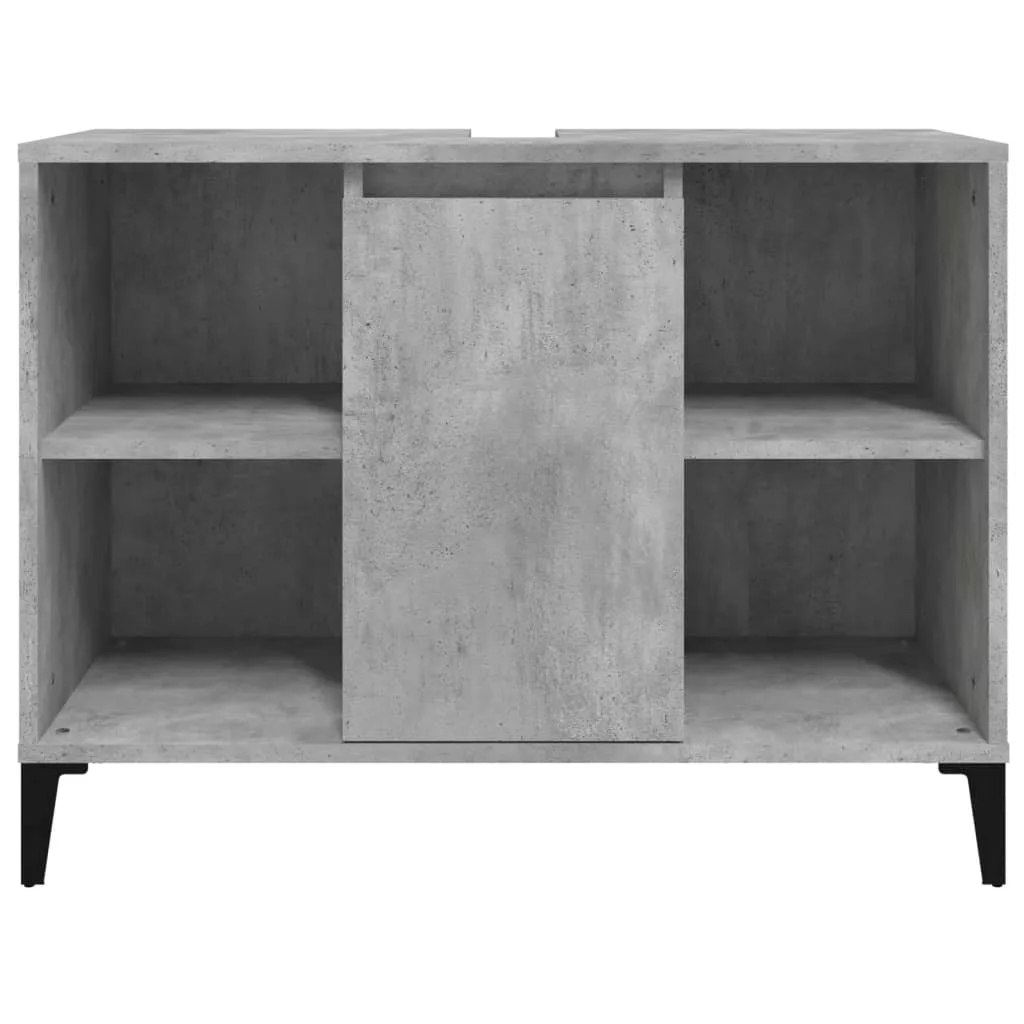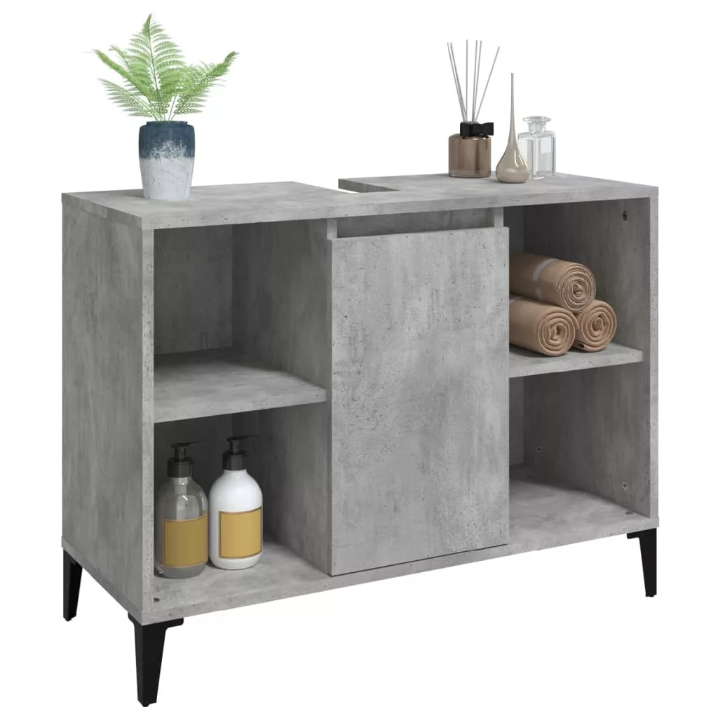 Ez a mosdószekrény fürdőszobája nagyszerű kiegészítője lesz, rendezett és lenyűgöző megjelenést kölcsönözve neki! Tartós anyag: A szerelt fa kivételes minőségű, sima felületű, szilárd, stabil, és ellenáll a nedvességnek.Bőséges tárolóhely: A fürdőszobai mosdószekrény 5 rekesszel és egy ajtóval rendelkezik, amelyek különféle tárolási lehetőségeket és extra helyet kínálnak a fürdőszobában lévő tárgyak tárolására. A fürdőszobaszekrény teteje ideális a mosdókagyló elhelyezésére.Fémlábak: A fémlábak modern és nyugodt stílust kölcsönöznek a belső térnek, miközben stabilitást biztosítanak.Könnyen tisztítható felület: A fürdőszobabútor nedves ruhával könnyen tisztítható. Figyelem:A felborulás elkerülése érdekében ezt a terméket a mellékelt fali rögzítőeszközzel kell használni. Jó tudni:A szerelés megkönnyítése érdekében minden termék kézikönyvvel együtt kerül kiszállításra.A szállítás a mosdókagylót nem tartalmazza.