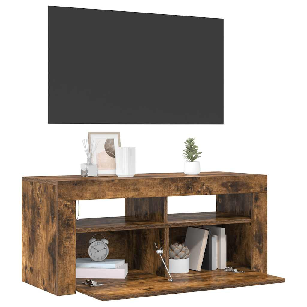 Ez a stílusos, mégis praktikus kialakítású, LED-lámpákkal ellátott TV-szekrény minden bizonnyal szobája középpontja lesz. Praktikus anyag: A szerelt fa kivételes minőségű, sima felületű, szilárd, stabil, és ellenáll a nedvességnek. A szerelt fából készült TV-szekrény könnyen tisztítható.Színes LED-világítás: Ez a TV-bútor RGB LED-világítással lett ellátva, amely különféle menükkel rendelkezik a fény színének változtatására, vagy beállítható a szín automatikus váltakozása. A LED-világítás kiemeli a szekrény modern kialakítását, és fokozza divatos hangulatát.Bőséges tárolóhely: A tárolóhely megkönnyíti a különféle tárgyak rendezett tárolását a médiabútorban.Elegáns megjelenés: A letisztult vonalaknak és az elegáns kialakításnak köszönhetően a médiabútor tökéletesen beleolvad környezetébe. Megjegyzés: Az egyszerű összeszerelés érdekében minden termékhez mellékelünk összeszerelési útmutatót.A termék USB-csatlakozóval rendelkezik, ám a hitelesített 5 V-os USB áramforrást a csomag nem tartalmazza. Ne használja ezt az elemet, ha valamelyik alkatrésze eltört, elszakadt vagy hiányzik. Ez a termék DC 5V-ról működik, de a tanúsított 5V-os USB-tápforrást nem tartalmazza. A magasabb feszültség túlmelegedést okozhat, ami a készülék károsodását, valamint a túlmelegedés és a tűz esetleges kockázatát okozhatja.