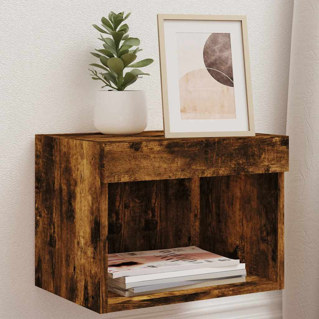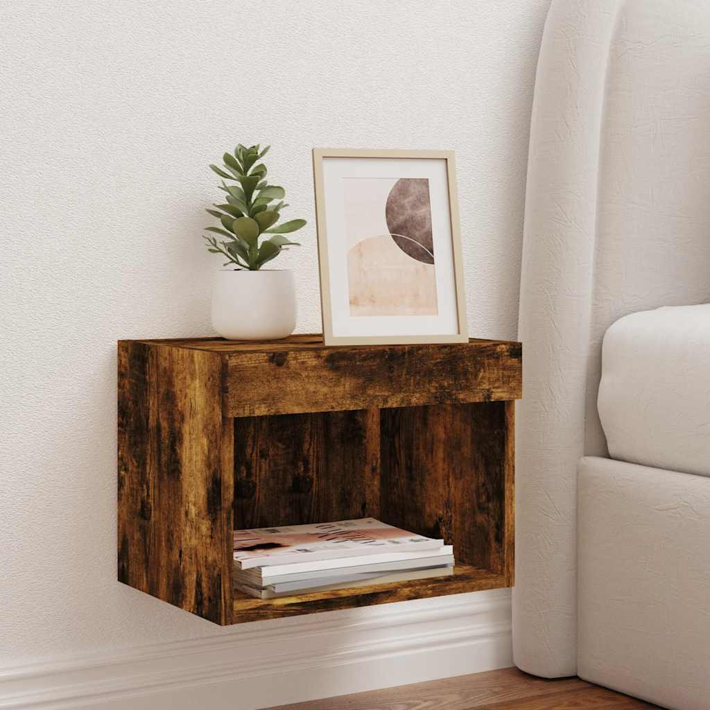 Ez a divatos, mégis praktikus kialakítású, LED-fényekkel ellátott éjjeliszekrény szobája fókuszpontjává válik. Tartós anyag: A szerelt fa kivételes minőségű, sima felületű, szilárd, stabil, és ellenáll a nedvességnek.Bőséges tárolóhely: Az éjjeliszekrény praktikus tárolóhelyet kínál folyóiratai, távirányítói és apróbb tárgyai rendezett és elérhető közelségben történő tartásához.RGB LED-világítás: Ez az éjjeliszekrény RGB LED-világítással lett ellátva, amely különféle menükkel rendelkezik a fény színének változtatására, és a szín automatikus váltakozása is beállítható.Kijelző funkció: A szekrény masszív teteje ideális dekorációs tárgyak, képkeretek vagy cserepes növények megjelenítésére.Falra szerelhető kialakítás: Ez a hálószobabútor falra szerelhető, hogy extra tárhelyet biztosítson. Ezáltal maximalizálhatja a padlóterületet, és tisztán tarthatja a környezetét. Jó tudni:A falon belüli csavarok és dugók nem alaptartozékok. Azt tanácsoljuk, hogy keressen és használjon kifejezetten az Ön falához megfelelő csavarokat és dugókat. Ha nem biztos benne, konzultálhat egy szakemberrel. Kérjük, olvassa el és kövesse az utasítások minden lépését.A termék USB-csatlakozóval rendelkezik, amelyhez hitelesített, 5 V-os USB áramforrás szükséges (nem alaptartozék).