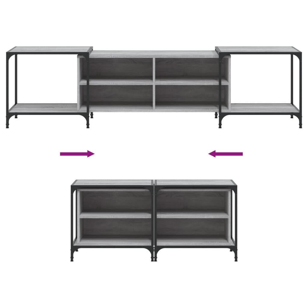 Ez a trendi TV-szekrény letisztult és stílusos kialakítású, így dekoratív és praktikus kiegészítője lesz szobája berendezésének. Tartós anyag: A szerelt fa kivételes minőségű, sima felületű, szilárd, stabil, és ellenáll a nedvességnek. A szerelt fából készült TV-szekrény könnyen tisztítható.Bőséges tárolóhely: Ez a polcokkal ellátott TV-bútor elegendő helyet kínál alapvető holmijai kézközelben történő rendezett tárolásához.Állítható kialakítás: A tévészekrény szélessége igényei szerint állítható. Emellett a műanyag párnákkal ellátott állítható lábak egyensúlyban tartják a médiaszekrényt egyenetlen talajon, és növelik a stabilitását.Bemutatófunkció: A TV-asztal masszív lapja tökéletes helyet biztosít cserepes növények, képkeretek és egyéb dísztárgyak elhelyezésére.Fémváz: A fémváz ipari stílust csempész otthonába, és az erőről, a stabilitásról is gondoskodnak. Figyelem:A felborulás elkerülése érdekében ezt a terméket a mellékelt fali rögzítőeszközzel kell használni.