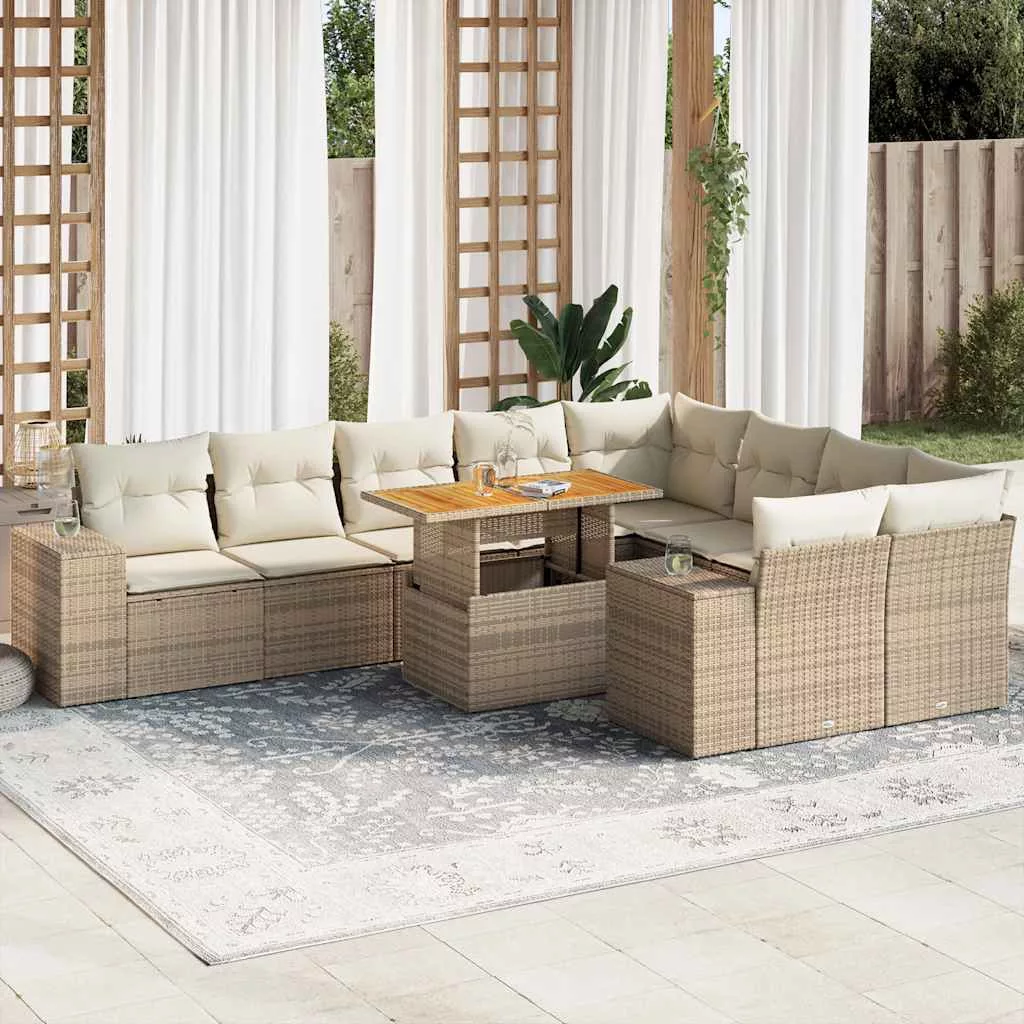 10 részes bézs polyrattan akácfa kerti ülőgarnitúra párnával