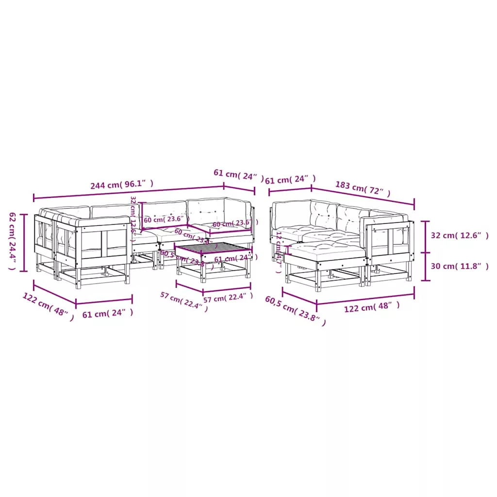 Ez a rácsos kialakítással és puha párnával rendelkező fa kerti társalgószett kertje, udvara vagy terasza remek kiegészítője lesz, ahol családtagjai vagy barátai körében társaloghat. Tömör fenyőfa: A tömör fenyőfa egy gyönyörű természetes anyag. A fenyőfa erezete egyenes, a csomók pedig jellegzetes, rusztikus megjelenést kölcsönöznek az anyagnak.Erős és stabil váz: A fa váz masszívvá és stabillá teszi a pihenőgarnitúrát a mindennapos kültéri használathoz.Kényelmes ülésélmény: A háttámla és a kartámasz extra kényelmet biztosít a kerti bútorgarnitúra számára. Ráadásul a vastagon bélelt párnák is kényelmet nyújtanak ülés közben.Moduláris kialakítás: A kanapészett rugalmasan és könnyen mozgatható. Kombinálhatja más moduláris elemekkel, hogy létrehozza saját személyes kerti pihenőgarnitúráját! Jó tudni:A kültéri bútor szépségének megőrzése érdekében javasoljuk, hogy vízálló huzattal fedje be.