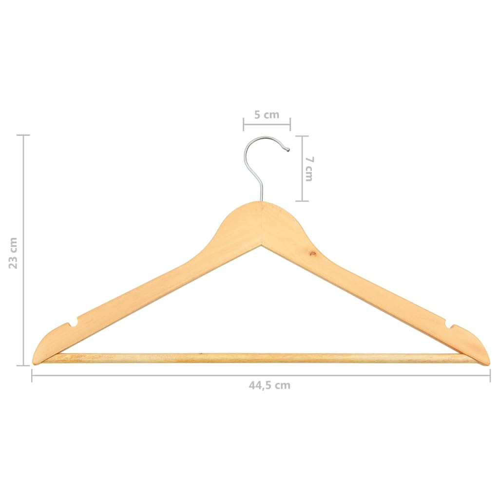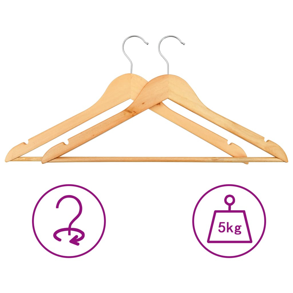 Ez a fa akasztószett keményfából és fémből készült, így elég strapabíró és masszív ahhoz, hogy nehezebb súlyt is megtartson. A 360 fokban elforgatható akasztó rugalmas megoldást kínál ruhái különféle helyeken történő tárolásához. A két oldalán lévő rovátkák megakadályozzák, hogy a ruhák vagy kiegészítők lecsússzanak róluk.