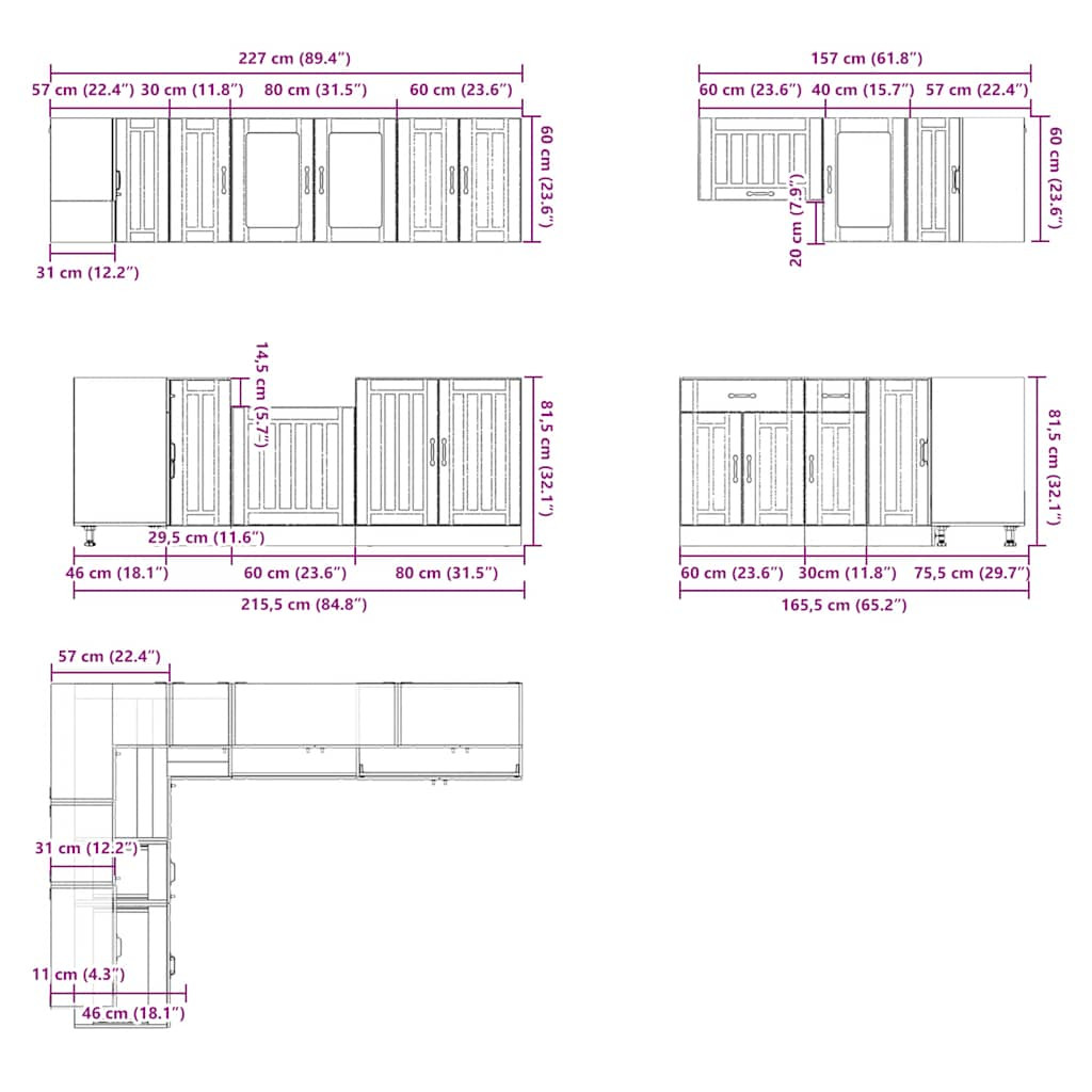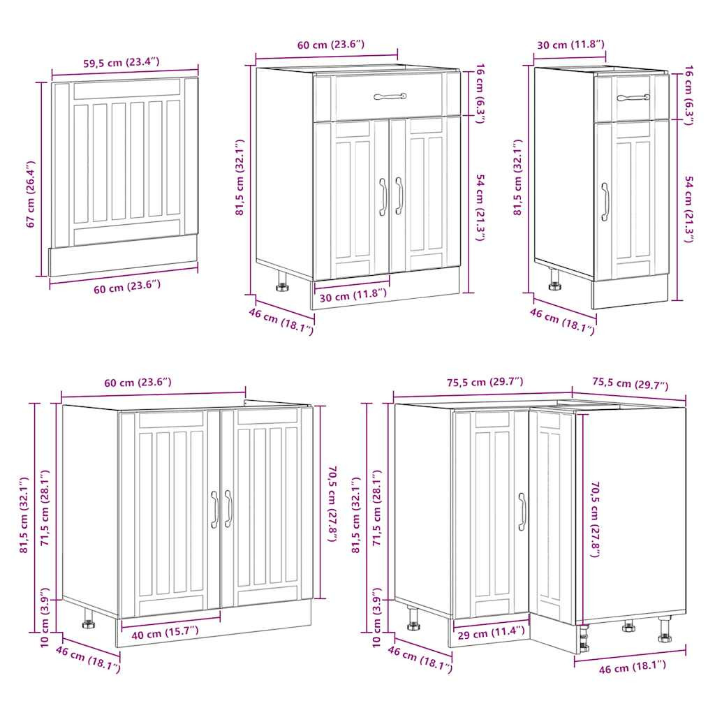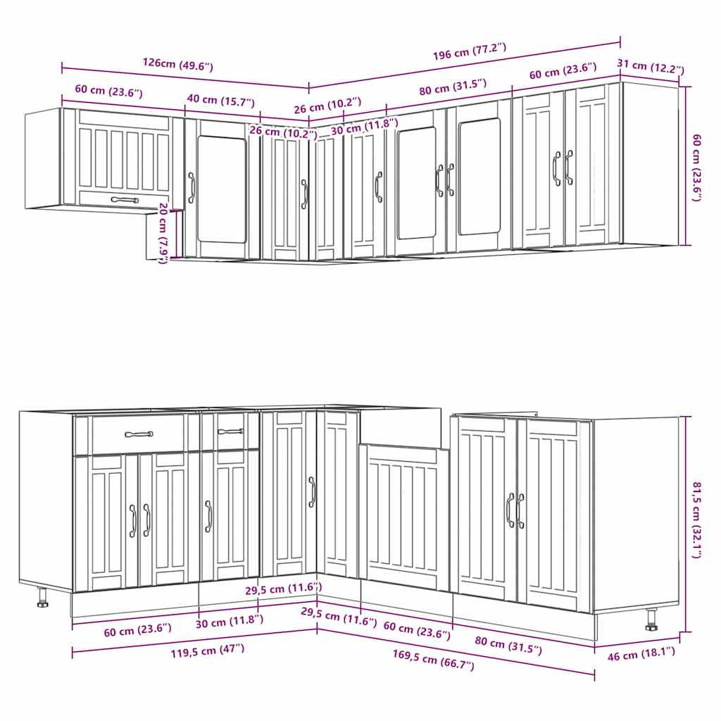Ez az elegáns kialakítású, tizenegy részes konyhai szekrénygarnitúra optimalizálja konyhája terét, és bőséges tárolóhelyet biztosít személyes tárgyainak! Stabil és tartós anyag: A szerelt fa tartós és stabil anyag sima felülettel, amely ellenáll a nedvességnek, a vetemedésnek és a hasadásnak, így megbízható választás különféle célokhoz.Bőséges tárolóhely: A konyhaszekrénykészlet számos rekesszel rendelkezik, és elegendő helyet kínál tálak, tányérok, edények és egyéb konyhai eszközök tárolására.Állítható lábak: Az alsó szekrények állítható lábakkal rendelkeznek, amelyek magassága a konyha elrendezésének megfelelően állítható.Könnyen karbantartható: A sima felületnek köszönhetően ezek a konyhaszekrények könnyen tisztíthatók nedves ruhával, és kevesebb karbantartást igényelnek. Figyelem:A felborulás elkerülése érdekében ezt a terméket a mellékelt fali rögzítőeszközzel kell használni. Jó tudni:A falon belüli csavar(ok) és dugó(k) nem alaptartozékok. Keressen és használjon a falának megfelelő csavar(oka)t és dugó(ka)t. Ha bizonytalan, kérje szakember tanácsát. Gondosan olvassa el és kövesse a használati utasítás minden lépését.A munkalap, a mosogató és a csaptelep nem tartozéka a szállításnak.