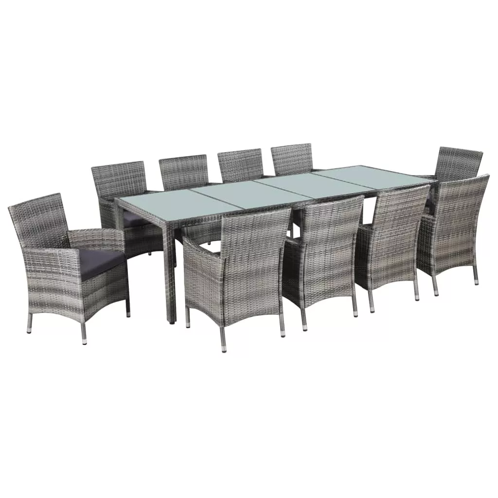 Ez a polyrattan étkezőgarnitúra tökéletes választás, ha a szabadban - udvarán vagy kertjében - szeretne vacsorázni vagy pihenni. A szett tartalma: 1 db asztal, 4 db szék és 8 db párna. A kerti bútorgarnitúra erős, porszórt acélvázzal rendelkezik, így nagyon stabil és tartós. A vízálló PE rattannak köszönhetően az étkezőgarnitúra könnyen tisztítható, strapabíró és mindennapos kültéri használatra is alkalmas. Az üveg asztallap nedves ruhával is könnyen tisztítható. A vastag, puha, habszivacsos ülőpárnák rendkívül kényelmesek. A kevés karbantartást igénylő poliészter párnahuzat könnyen eltávolítható és mosható. Az egész kerti étkezőgarnitúra könnyen összeszerelhető. A szállítmány 1 asztalt, 10 széket és 10 ülőpárnát tartalmaz. Megjegyzés : Eső, hó vagy fagy esetén azt tanácsoljuk, hogy takarja le a garnitúrát.