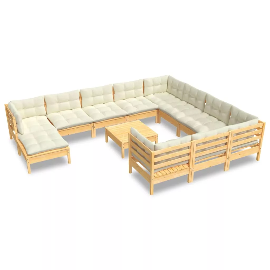 12 részes fenyőfa kerti ülőgarnitúra krémszínű párnákkal