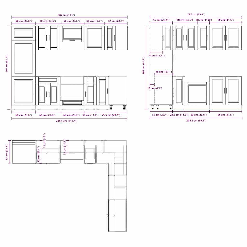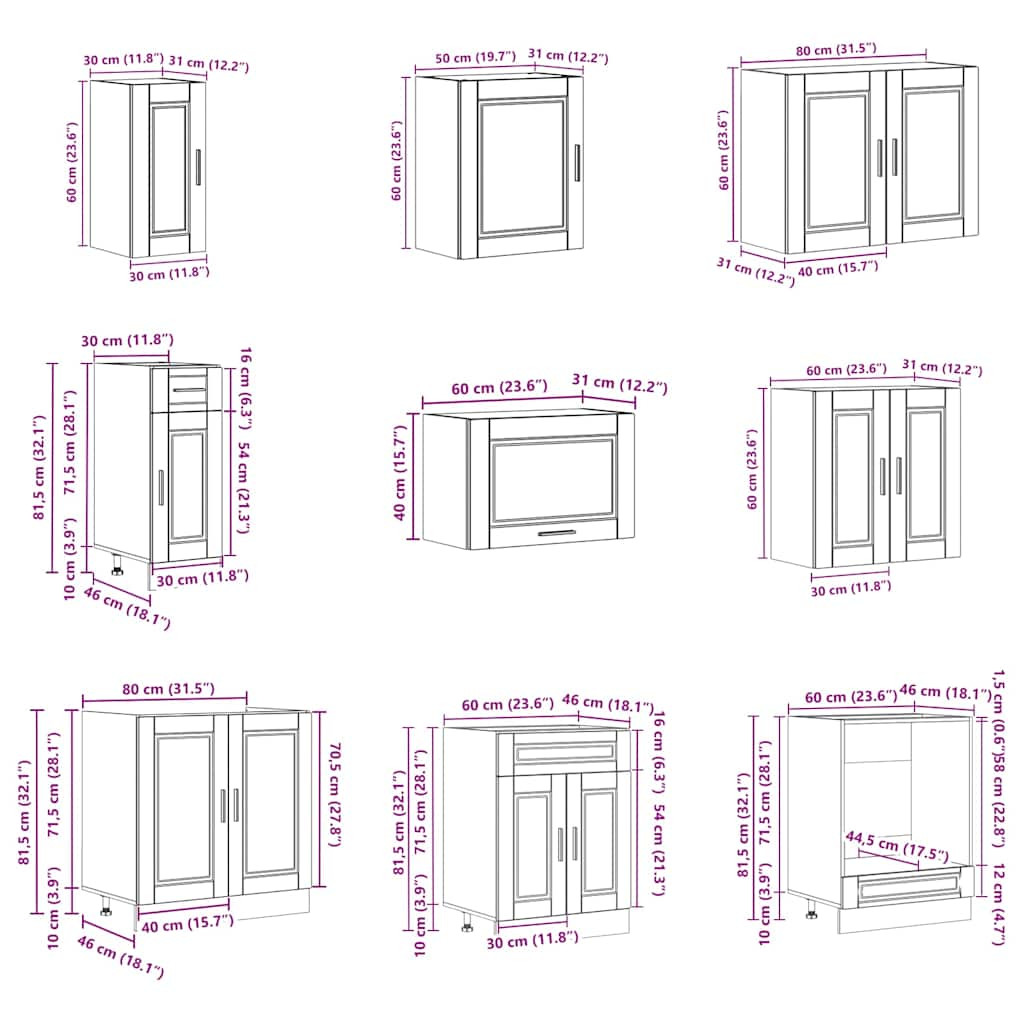 Ez az elegáns kialakítású, tizennégy részes konyhai szekrénygarnitúra optimalizálja konyhája terét, és bőséges tárolóhelyet biztosít személyes tárgyainak! Stabil és tartós anyag: A szerelt fa tartós és stabil anyag sima felülettel, amely ellenáll a nedvességnek, a vetemedésnek és a hasadásnak, így megbízható választás különféle célokhoz.Bőséges tárolóhely: A konyhaszekrénykészlet számos rekesszel rendelkezik, és elegendő helyet kínál tálak, tányérok, edények és egyéb konyhai eszközök tárolására.Állítható lábak: Az alsó szekrények állítható lábakkal rendelkeznek, amelyek magassága a konyha elrendezésének megfelelően állítható.Könnyen karbantartható: A sima felületnek köszönhetően ezek a konyhaszekrények könnyen tisztíthatók nedves ruhával, és kevesebb karbantartást igényelnek. Figyelem:A felborulás elkerülése érdekében ezt a terméket a mellékelt fali rögzítőeszközzel kell használni. Jó tudni:A falon belüli csavar(ok) és dugó(k) nem alaptartozékok. Keressen és használjon a falának megfelelő csavar(oka)t és dugó(ka)t. Ha bizonytalan, kérje szakember tanácsát. Gondosan olvassa el és kövesse a használati utasítás minden lépését.A munkalap, a mosogató és a csaptelep nem tartozéka a szállításnak.