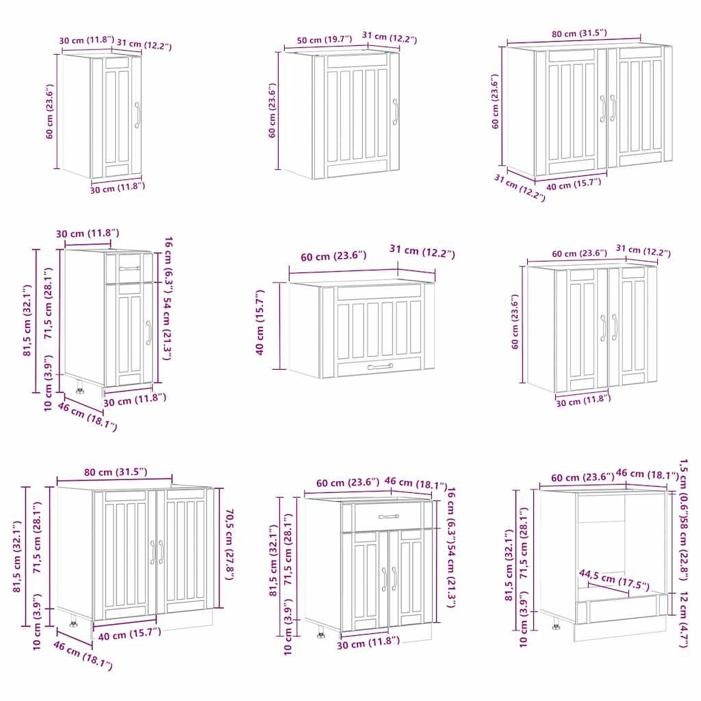 Ez az elegáns kialakítású, tizennégy részes konyhai szekrénygarnitúra optimalizálja konyhája terét, és bőséges tárolóhelyet biztosít személyes tárgyainak! Stabil és tartós anyag: A szerelt fa tartós és stabil anyag sima felülettel, amely ellenáll a nedvességnek, a vetemedésnek és a hasadásnak, így megbízható választás különféle célokhoz.Bőséges tárolóhely: A konyhaszekrénykészlet számos rekesszel rendelkezik, és elegendő helyet kínál tálak, tányérok, edények és egyéb konyhai eszközök tárolására.Állítható lábak: Az alsó szekrények állítható lábakkal rendelkeznek, amelyek magassága a konyha elrendezésének megfelelően állítható.Könnyen karbantartható: A sima felületnek köszönhetően ezek a konyhaszekrények könnyen tisztíthatók nedves ruhával, és kevesebb karbantartást igényelnek. Figyelem:A felborulás elkerülése érdekében ezt a terméket a mellékelt fali rögzítőeszközzel kell használni. Jó tudni:A falon belüli csavar(ok) és dugó(k) nem alaptartozékok. Keressen és használjon a falának megfelelő csavar(oka)t és dugó(ka)t. Ha bizonytalan, kérje szakember tanácsát. Gondosan olvassa el és kövesse a használati utasítás minden lépését.A munkalap, a mosogató és a csaptelep nem tartozéka a szállításnak.