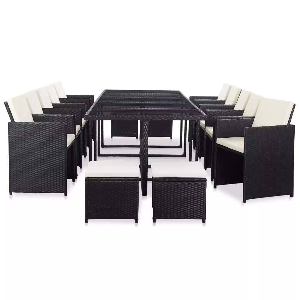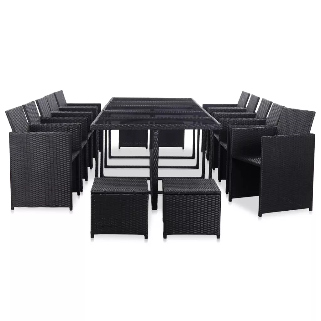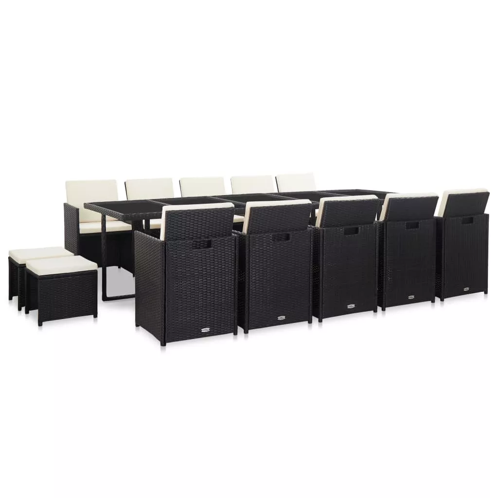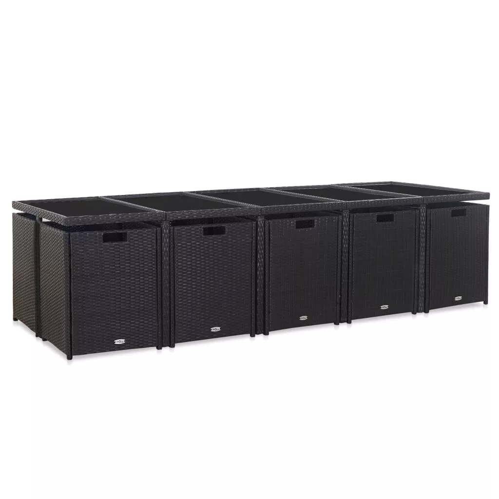 Ez az acélvázas, stílusos dizájnnal rendelkező rattan étkezőszett tökéletes választás kültere számára. Kényelmes ülőalkalmatosságot biztosít egy családi vacsorához, olvasáshoz vagy pihenéshez. Az acélváz hozzájárul a szett robusztusságához, míg az időjárás- és vízálló PE rattan miatt könnyen tisztítható a garnitúra. Mivel a szerkezetük könnyű, ezért a bútordarabok könnyen mozgathatók. A vastag, vízálló poliészterből készült levehető ülő- és hátpárnák kétségkívül kiváló kényelmet biztosítanak. A további helytakarékosság érdekében használaton kívül a zsámolyok a székek alá tolhatóak és ezek együtt az asztal alá tolva tárolhatóak. A szállítmány 1 üveglapos asztalt, 10 rattanszéket, 4 zsámolyt és 24 levehető párnát tartalmaz. Figyelem: Ahhoz, hogy a garnitúra minél tovább szolgálhassa Önt, eső, hó vagy fagy esetén, kérjük takarja le.