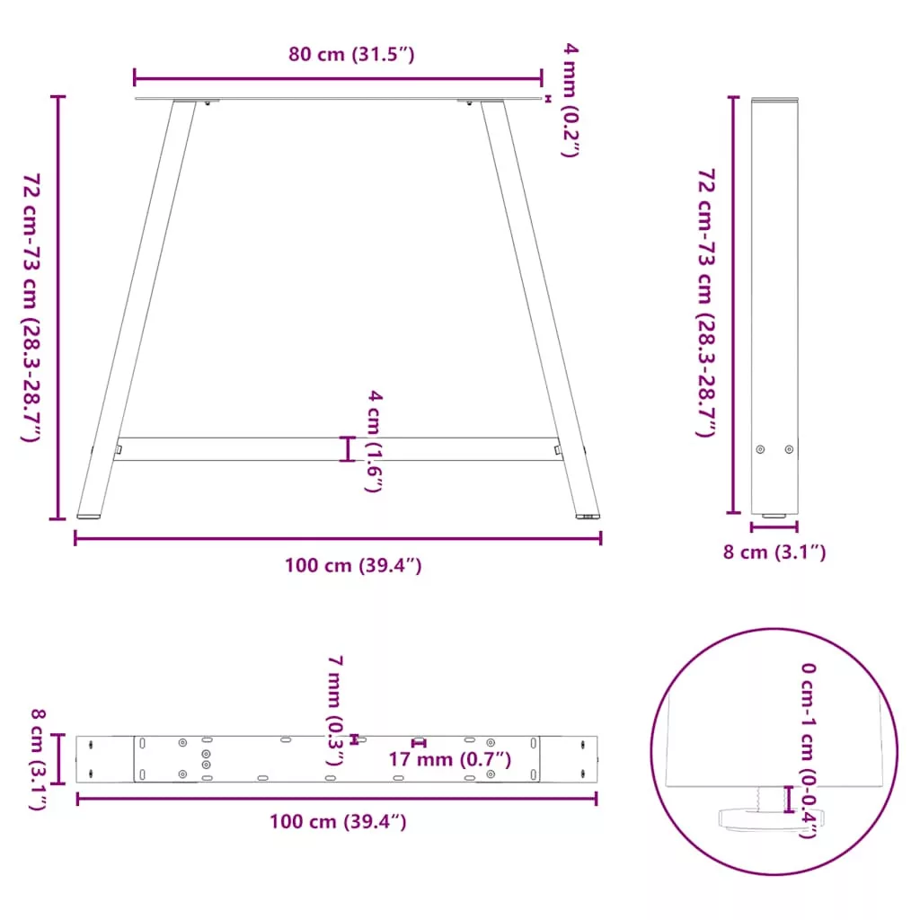 Ezek az étkezőasztal lábak ötvözik a formát és a funkciót. Ideális választás étkezőasztala személyre szabásához.Tartós anyag: Ez az étkezőasztal láb porszórt acélból készült, így masszív és hosszú élettartamú.Masszív szerkezet: Az étkezőasztal lábának A-alakú kialakítása biztosítja, hogy elbírja a nehéz asztallapot is.Praktikus kialakítás: Ez az étkezőasztal láb állítható lábszintezőkkel rendelkezik, amelyek stabilitást biztosítanak még egyenetlen padlón is, és minimalizálják a padló karcolódását. Ezenkívül a konzol előre fúrt lyukakkal és a szállítási terjedelemben mellékelt csavarokkal rendelkezik, amelyekkel a láb az asztallaphoz rögzíthető (nem tartozék), így könnyen összeszerelhető.Modern esztétika: Az asztalláb letisztult vonalakkal és geometrikus kialakítással rendelkezik, hogy javítsa a bútor összképét. És bármilyen megfelelő méretű asztallaphoz jól illik.Jó tudni:A szállítmány csak az asztallábakat tartalmazza, az asztallap nem része a csomagnak.