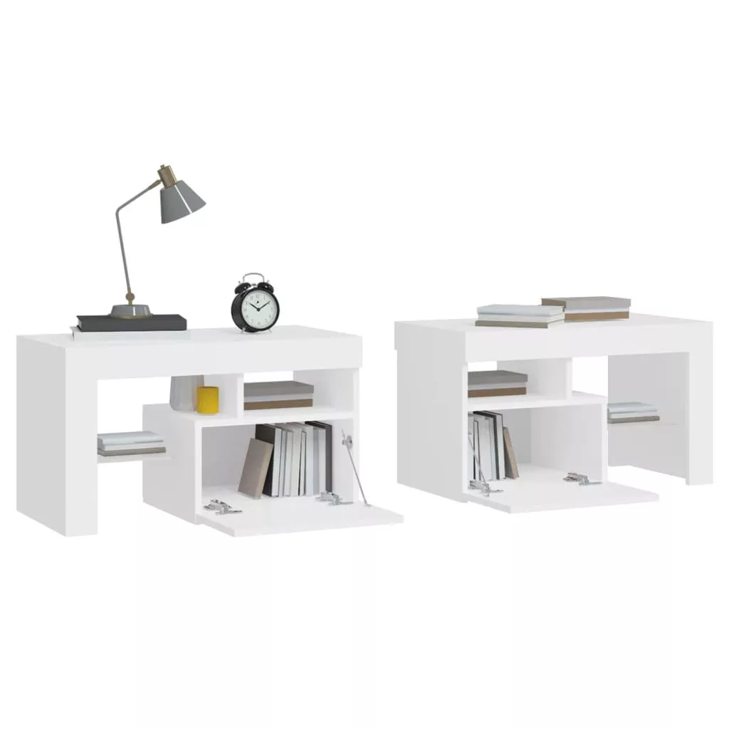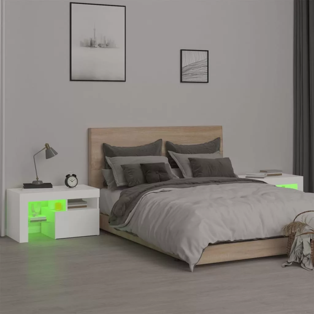 Vigyen modern bájt otthonába ezekkel az elegáns éjjeliszekrényekkel! A stílusos, mégis praktikus kialakítású LED-lámpás éjjeliszekrények minden bizonnyal szobája középpontjává fognak válni. Tartós anyag: A szerelt fa kivételes minőségű, sima felületű, szilárd, stabil, és ellenáll a nedvességnek. Színes LED-világítás: Ez a szekrény RGB LED-világítással lett ellátva, amely különféle menükkel rendelkezik a fény színének változtatására, vagy beállítható a szín automatikus váltakozása. A LED-világítás kiemeli a szekrény modern kialakítását, és fokozza divatos hangulatát.Bőséges tárolóhely: Az éjjeliszekrény rengeteg tárhelyet biztosít folyóiratai, könyvei, távirányítói és egyéb apró tárgyai rendezetten és könnyen elérhető helyen való tartásához.Kijelző funkció: A kisszekrény masszív teteje ideális dísztárgyak, képkeretek vagy cserepes növények megjelenítésére. Megjegyzés:A termék USB-csatlakozóval rendelkezik, ám a hitelesített 5 V-os USB áramforrást a csomag nem tartalmazza.Az egyszerű összeszerelés érdekében minden termékhez mellékelünk összeszerelési útmutatót.