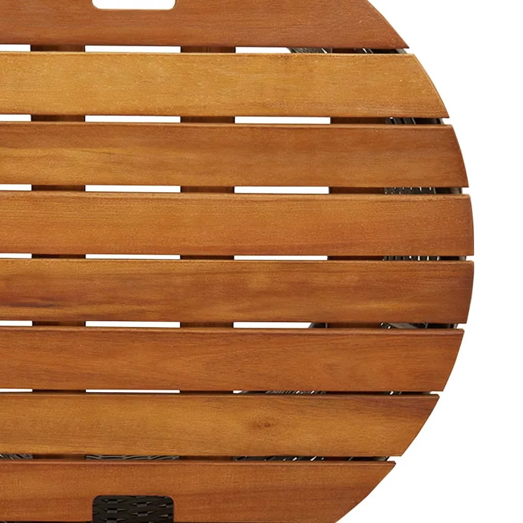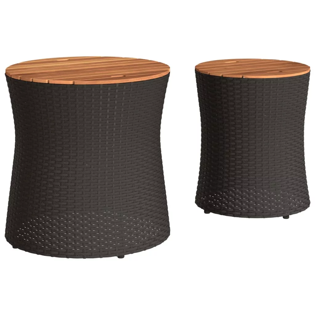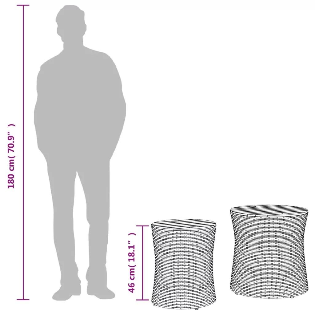 Gyűljön e sokoldalú kerti kisasztalok köré egy kávé mellett, csevegjen családjával és barátaival a kertben, az udvaron vagy a teraszon! Tartós anyag: A PE rattan, más néven polyrattan, egy erős, kevés karbantartást igénylő szintetikus anyag, amely úgy néz ki, mint a természetes rattan. Könnyű, könnyen tisztítható, tartóssága és időjárásálló tulajdonságai miatt gyakran használják kültéri bútorok készítéséhez.Fa asztallap: A kültéri asztallap erős és tartós akácfából készült, így nedves ruhával könnyen tisztítható, és egy csipetnyi eleganciát kölcsönöz a kültéri környezetnek.Robusztus és stabil váz: A porszórt acél váz biztosítja, hogy a kis kanapéasztal erős és stabil legyen a mindennapi kültéri használathoz.Helytakarékos: A kisebb teraszasztal a nagyba helyezhető, hogy helyet takarítson meg. Jó tudni:A kültéri bútor szépségének megőrzése érdekében javasoljuk, hogy vízálló huzattal fedje be.