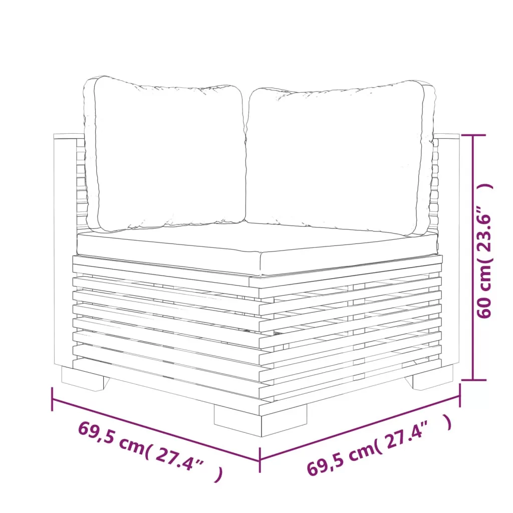 Ez a rácsos kialakítással és puha párnákkal rendelkező fa sarokkanapé kertje, terasza vagy udvara remek kiegészítője lesz, ahol családtagjai vagy barátai körében társaloghat, vagy egyszerűen csak élvezheti a kellemes időjárást. Tartós anyag: A tömör tíkfa egy gyönyörű, természetes anyag. A fa természetesen, illetve kemencében volt szárítva, majd finomra lett csiszolva az elegáns megjelenés érdekében. A tíkfa rendkívüli erejéről és időjárás-állóságáról ismert.Kényelmes ülés: Az extra párnák tovább növelik a kényelmet.Praktikus kialakítás: A kanapé könnyen mozgatható, ami megkönnyíti az Ön igényeinek megfelelő különböző elrendezések kialakítását. Más, azonos kialakítású és stílusú elemes kanapéegységeket is talál nálunk, hogy berendezhesse saját társalgóját.Megjegyzés:Az egyszerű összeszerelés érdekében minden termékhez mellékelünk összeszerelési útmutatót.Kerti bútora élettartamának meghosszabbítása érdekében javasoljuk, hogy védje vízálló takaróval. Maksimális 110 kg ülésenként. Legyen tudatában a nyílt tűz és más erős hőforrások kockázatának a termék környezetében.