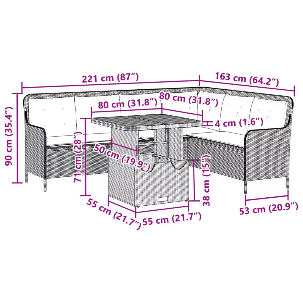 Ez a kerti ülőgarnitúra tökéletes kiegészítője lesz kertjének, teraszának vagy udvarának, kényelmes és hívogató teret biztosítva a családdal és a barátokkal való beszélgetéshez, vagy egyszerűen csak pihenéshez a szabadban. Tartós anyag: A PE rattan, más néven polyrattan, egy erős, kevés karbantartást igénylő szintetikus anyag, amely úgy néz ki, mint a természetes rattan. Könnyű, könnyen tisztítható, tartóssága és időjárásálló tulajdonságai miatt gyakran használják kültéri bútorok készítéséhez.Kényelmes ülőélmény: Ez a vastagon bélelt párnákkal kiegészített kültéri bútor kényelmes ülőélményt kínál.Levehető és mosható huzat: Ezek az ülőpárnák levehető huzattal rendelkeznek az egyszerű mosás és karbantartás érdekében.Állítható asztallap: Az asztallap felemelhető, így az asztal magasabbra tehető, ami a kültéri asztalt dohányzóasztalból étkezőasztallá alakítja. Ideális vendégek fogadásakor vagy kinti étkezéshez.Stabil és könnyen tisztítható asztallap: A kerti asztal akácfa lapja masszív, tartós és nedves ruhával könnyen tisztítható. Jó tudni:A kültéri bútor szépségének megőrzése érdekében javasoljuk, hogy vízálló huzattal fedje be.