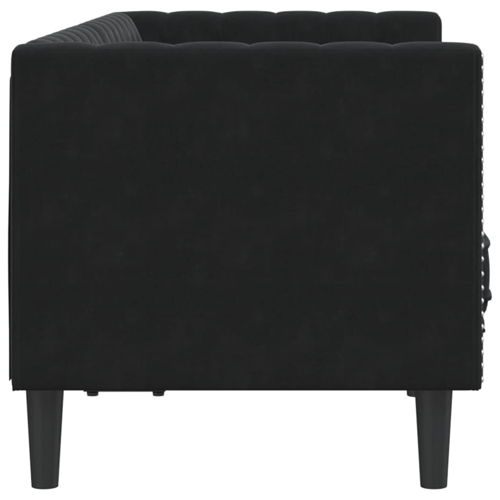 2 személyes fekete bársony Chesterfield kanapé hengerpárnákkal