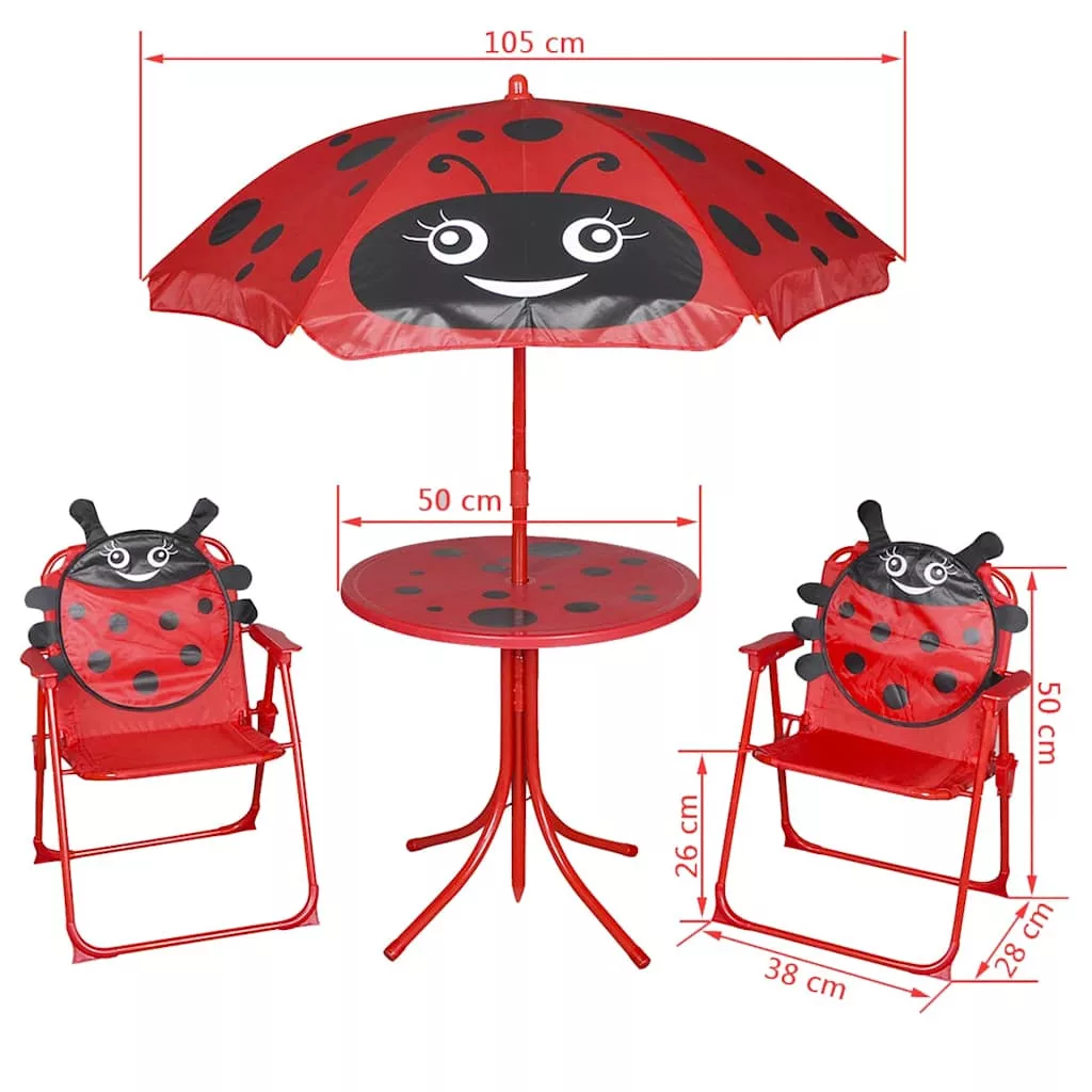 Ez a kerti szett egy asztalt, két széket, egy napernyőt tartalmaz melyet kifejezetten a gyerekeknek terveztek ahol jól érezhetik magukat, a kertben vagy a teraszon. A nagy teherbírású acél váz, az erős és robusztus kerti garnitúra lehetővé teszi a biztonságos ülősarkokat a gyerekeknek. A mellékelt esernyő megvédi az Ön kisgyerekét a naptól. A széket össze lehet hajtani amikor nincs használatban. A szállítmány 1 asztalt, 1 napernyőt és 2 széket tartalmaz. Nagyon könnyű összeszerelni. Figyelmeztetések Apró alkatrészek. Fulladásveszély. Nyílt lángtól távol tartandó. Legfeljebb 30 kg-os személy használhatja. Figyelem. 3 év alatti gyermekek számára nem alkalmas. Kis alkatrészek. Fulladást okozhat.