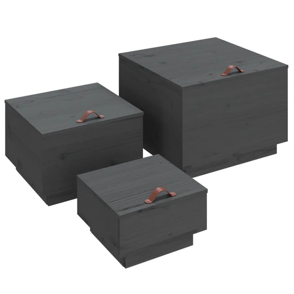 3 db szürke tömör fenyőfa tárolódoboz fedéllel