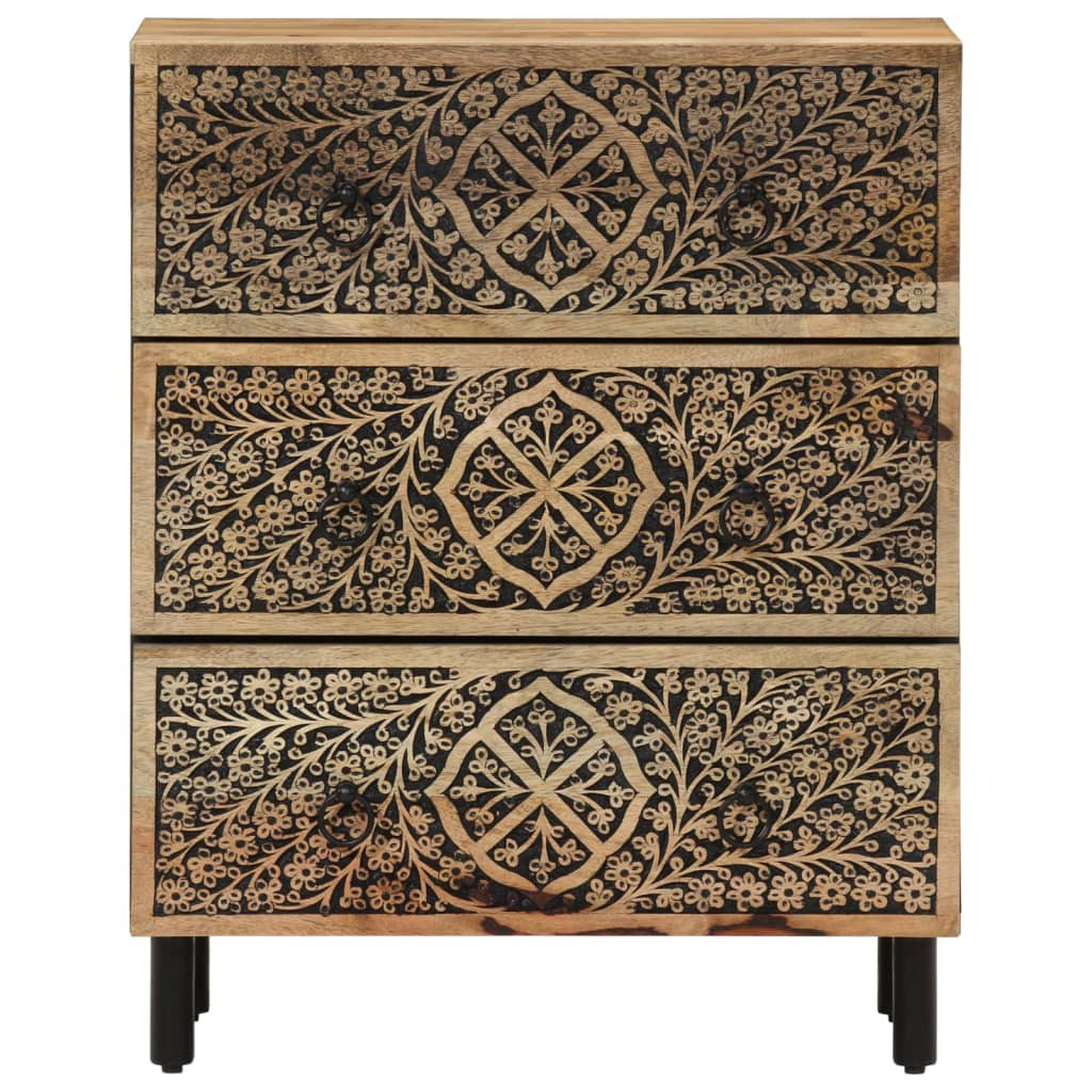 Ezek a modern, időtlen megjelenésű tálalószekrények otthona kiváló kiegészítői lehetnek. Tömör mangófa: A tömör mangófa egy erős, trópusi keményfa, melyből strapabíró bútorok készíthetőek. A fa gyönyörű erezetének köszönhetően minden darab kissé különbözik a többitől. A tömör mangófából készült szekrény rendkívül tartós és stabil.Bőséges tárolóhely: A kisszekrény bőséges helyet biztosít alapvető holmijai kézközelben történő rendezett tárolásához.Bemutató funkció: A tárolószekrény teteje tökéletes dísztárgyak, fotóalbumok vagy kis növények elhelyezésére.Masszív lábak: A vaslábak szilárdságot és stabilitást biztosítanak a tálalószekrénynek.Retró stílus: A kézzel faragott virágmintákkal díszített otthoni rendszerező a retró stílus luxusát viszi otthonába, így garantáltan a szoba központi eleme lesz. Jó tudni:Minden termék egyedi, a szín és az erezet változik. A kiszállítás véletlenszerűen történik, biztosítva terméke exkluzivitását és egyediségét. Figyelem:A felborulás elkerülése érdekében ezt a terméket a mellékelt fali rögzítőeszközzel kell használni.