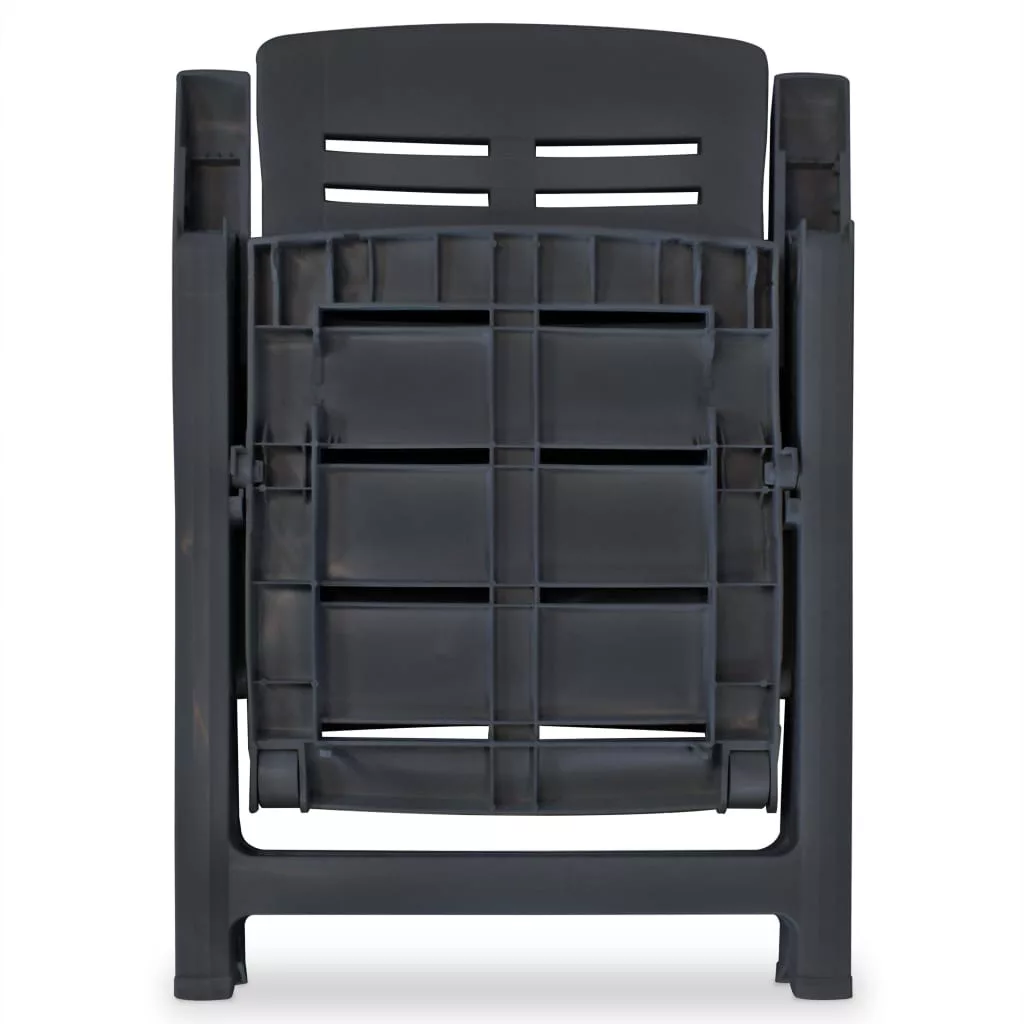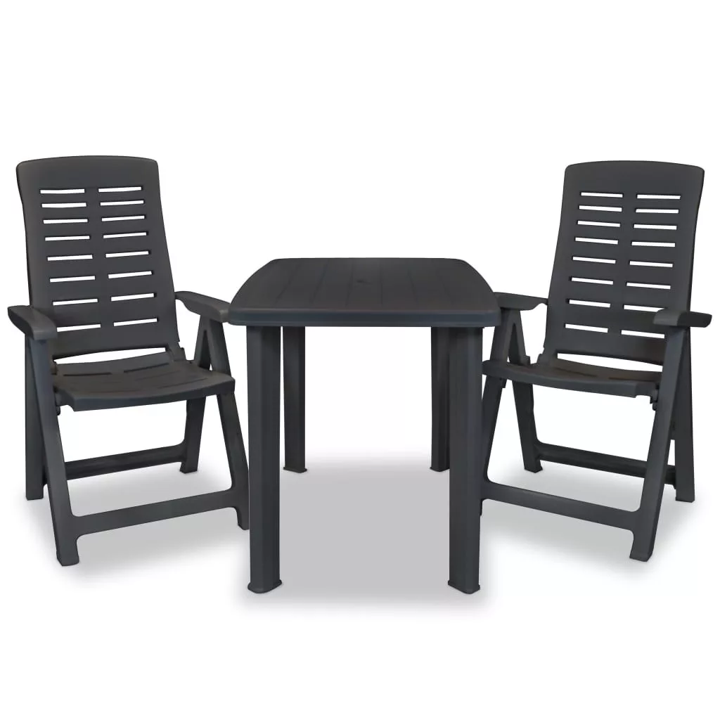 Ez az időjárás viszontagságainak ellenálló bisztró étkezőgarnitúra remek választás szabadtéri étkezéshez a kertben, a verandán vagy kempingezéshez. A kerti asztal egy napernyő behelyezésére alkalmas nyílással rendelkezik, hogy az árnyékban hűsölhessen. A székek háttámlái 4 különböző állásban rögzíthetőek, hogy mindig a legkényelmesebb pozícióban pihenhessen. A székek összecsukhatóak, amikor éppen nincs szükség rájuk. A garnitúra strapabíró műanyagból készült, melynek köszönhetően időjárásálló és könnyen tisztítható. A kültéri garnitúra ezenfelül könnyű is, ami elősegíti a mozgatását ás tárolását. A szállítmány 1 asztalt és 2 összecsukható széket tartalmaz. Maximum 110 kg ülésenként.