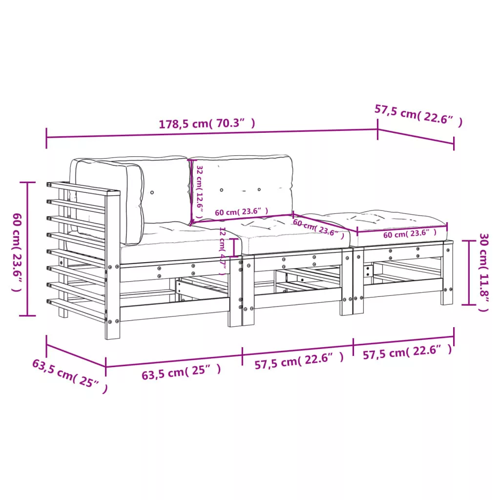 • Középső kanapé mérete: 57,5 x 63,5 x 60 cm (Ho x Szé x Ma)