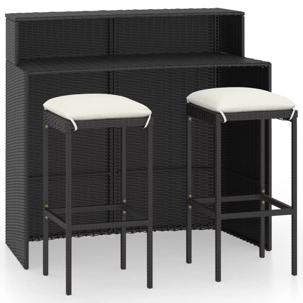 Ez a kerti bárszett elegáns dizájnnal rendelkezik, és kertje, udvara vagy terasza fénypontja lesz. Az időjárás- és vízálló polyrattanból készült bárszett könnyen tisztítható, kopásálló, és mindennapi használatra alkalmas. A porszórt acélváz kiemelkedően erőssé és tartóssá teszi az asztalt és a székeket. Könnyű szerkezetének köszönhetően az összes bútordarab könnyen mozgatható. A vastag, eltávolítható párnák rendkívül kényelmesek. A cipzárral ellátott huzatok könnyen levehetőek és moshatóak. Figyelem: kültéri bútora élettartamának meghosszabbítása érdekében javasoljuk, hogy tisztítsa rendszeresen, és ne hagyja feleslegesen a szabadban, védelem nélkül.Tisztítás: használjon enyhe szappanoldatotTárolás: Ha lehetséges, tárolja zárt, hűvös, száraz helyen. Ha a terméket a szabadban tárolja, védje vízálló burkolattal. Eső vagy havazás után törölje le és szárítsa fel a felesleges vizet vagy havat a sík felületekről. Hagyjon elegendő légkeringést a nedvességből eredő károk elkerülése érdekében. Maksimális 110 kg ülésenként. Legyen tudatában a nyílt tűz és más erős hőforrások kockázatának a termék környezetében.