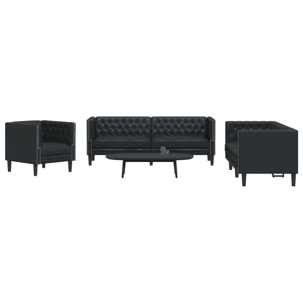 3 részes fekete műbőr Chesterfield kanapégarnitúra